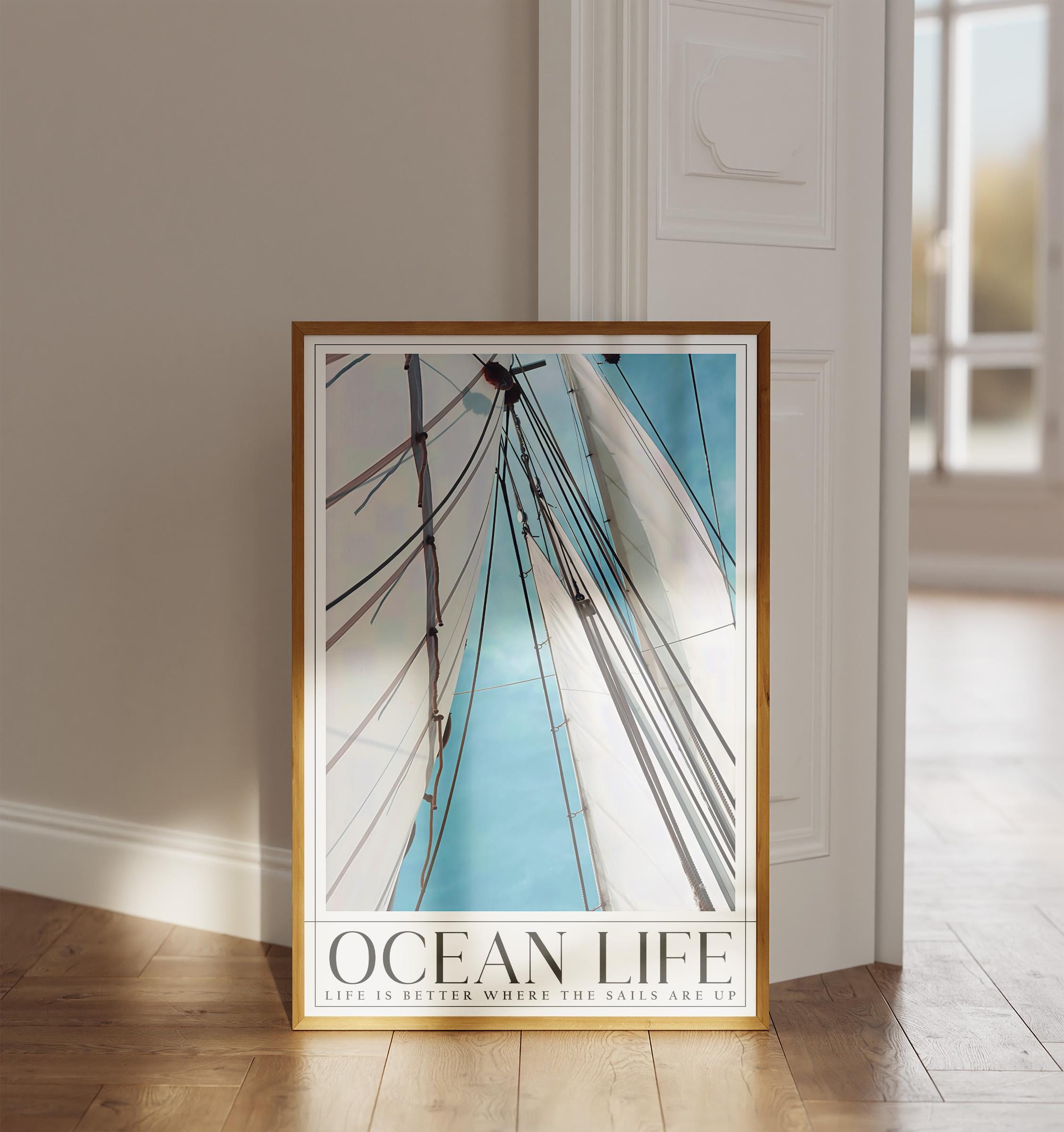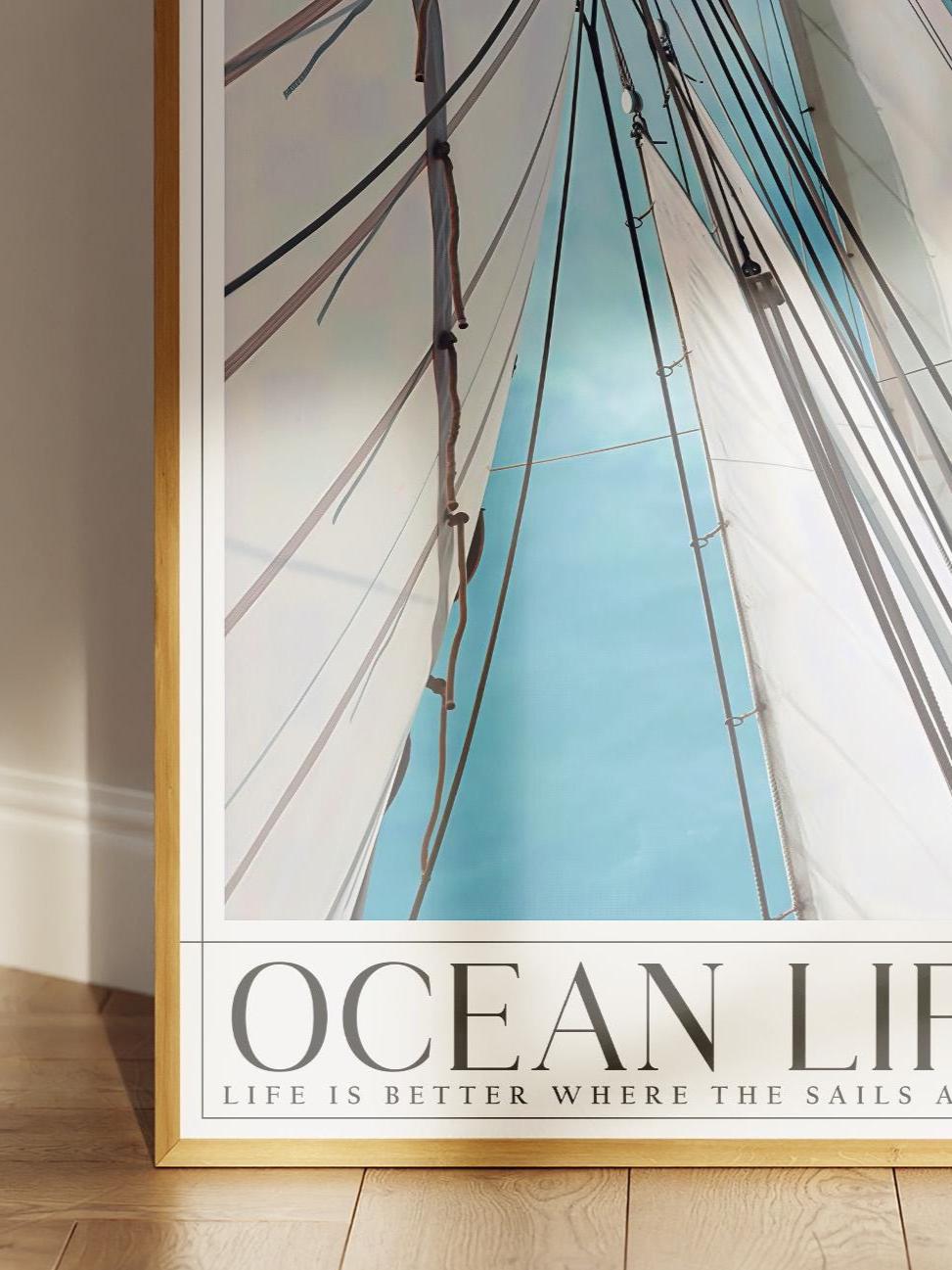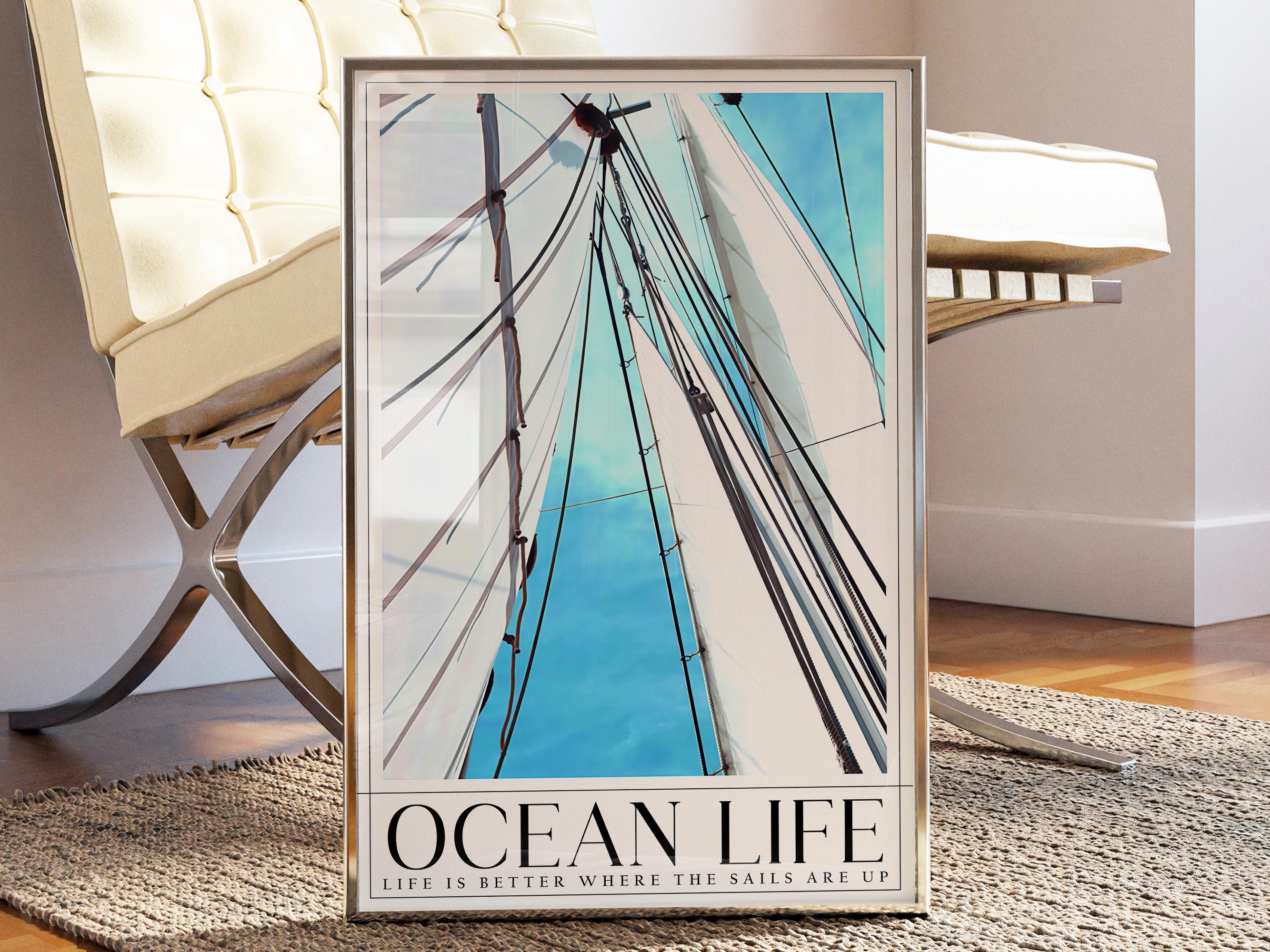 Bring the calming vibes of the ocean into your home with this beautiful nautical print. Featuring a dynamic upward view of sailboat masts and white sails against a bright blue sky, this poster perfectly captures the freedom of life at sea.