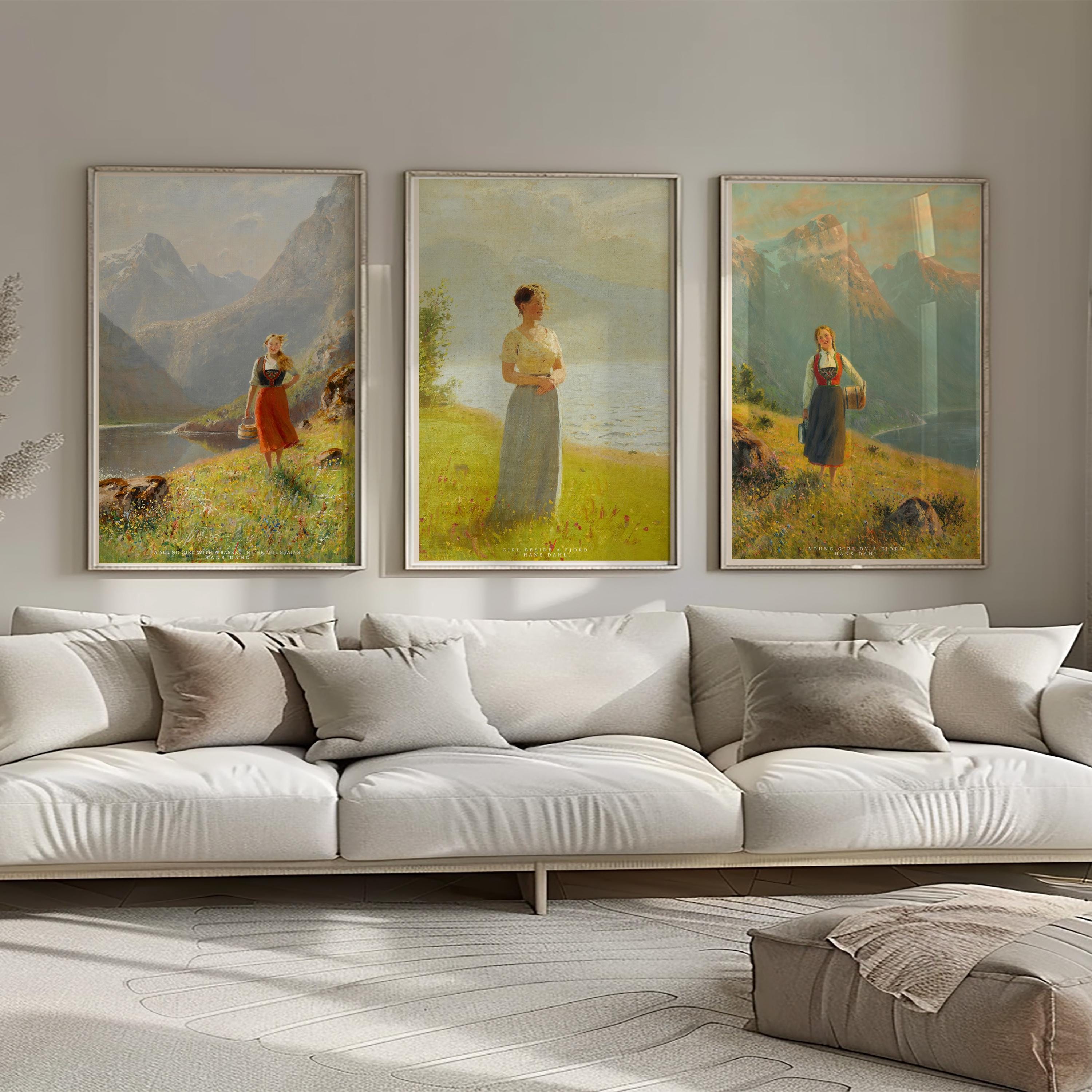 Each print in this set beautifully depicts the majestic beauty of Norway's fjords, framed by towering mountains and featuring elegant figures in traditional attire, reflecting the timeless charm of Scandinavian folk art. The central piece often features a contemplative figure by the water's edge, flanked by two dynamic scenes of figures amidst the stunning natural grandeur. Together, these prints create a cohesive and breathtaking gallery wall that evokes peace, beauty, and a sense of historical romance.