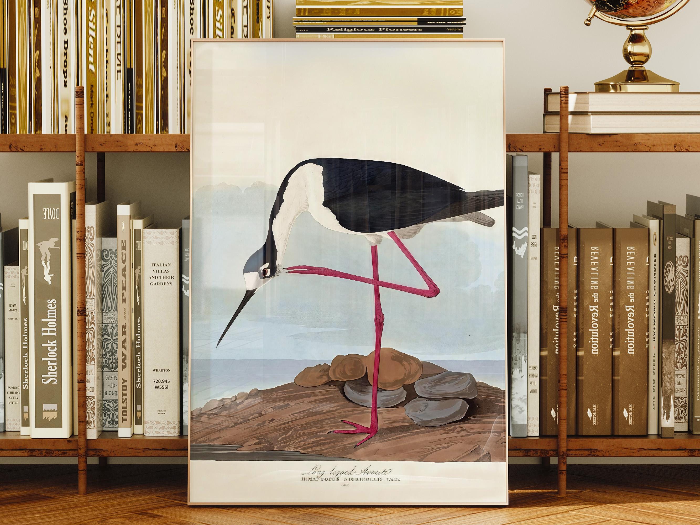 Bring timeless elegance to your space with this exquisite 19th century bird illustration, featuring the Long Legged Avocet (Himantopus nigricollis), originally documented by the French naturalist Louis Jean Pierre Vieillot. This beautifully detailed artwork captures the striking grace of the black-winged stilt with its delicate proportions, long crimson legs, and sharp beak, making it a perfect piece for bird lovers, natural history enthusiasts, and vintage art collectors.
