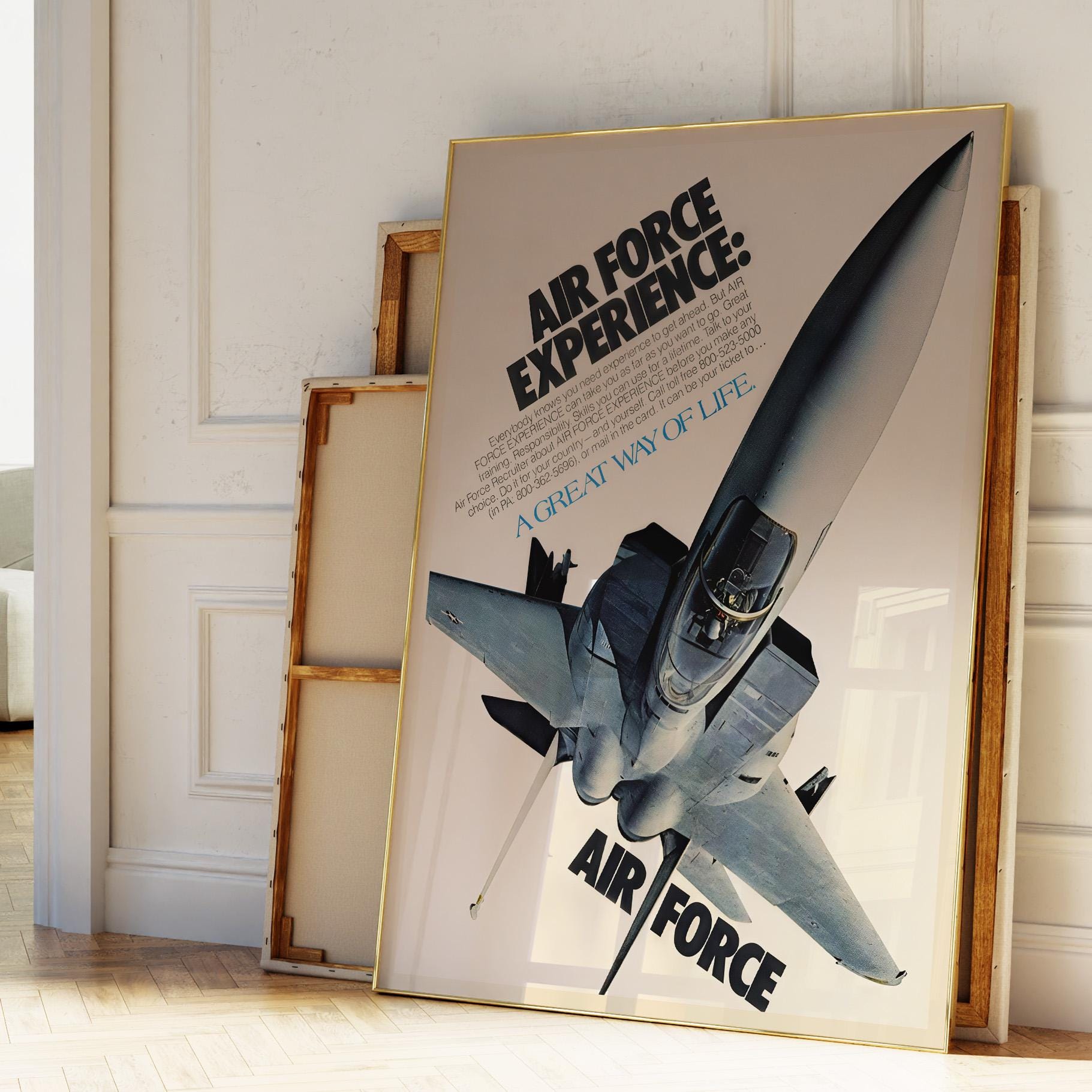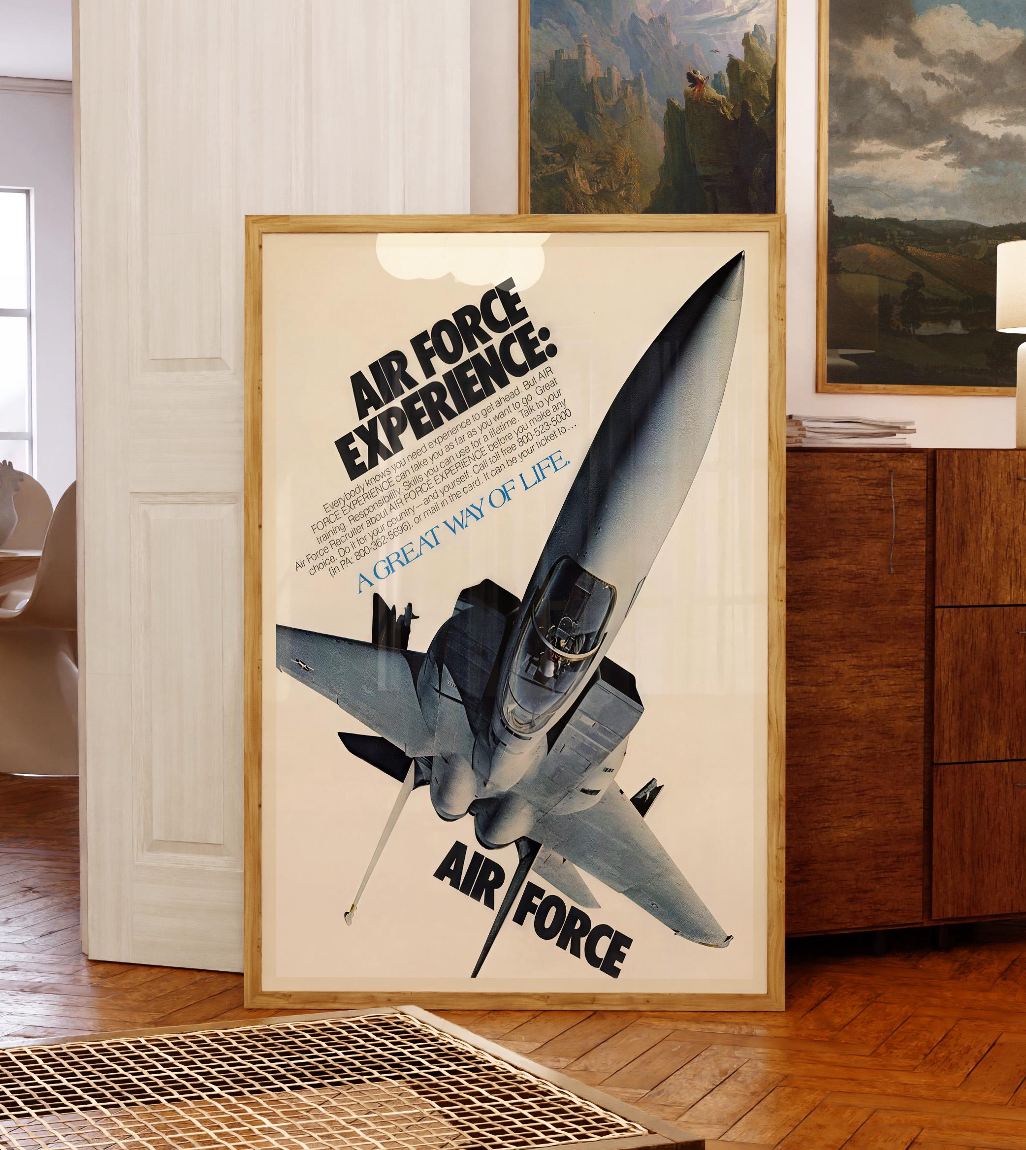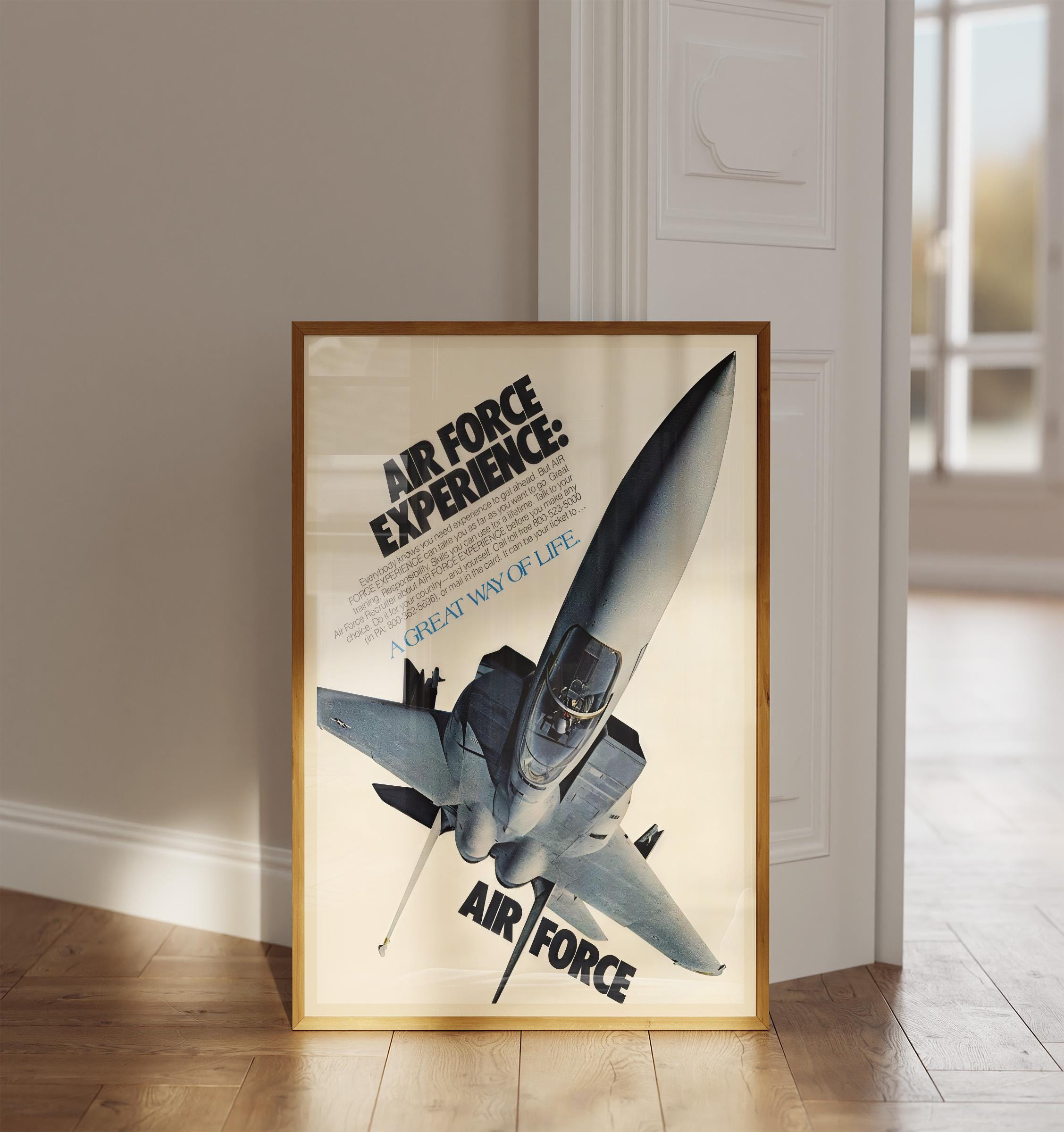 There’s a certain energy in this image the sharp nose of an F-15 Eagle slicing through white airspace, the words “Air Force Experience” standing bold beside it. This poster captures not just a machine, but an era when flight was a statement of ambition and confidence.