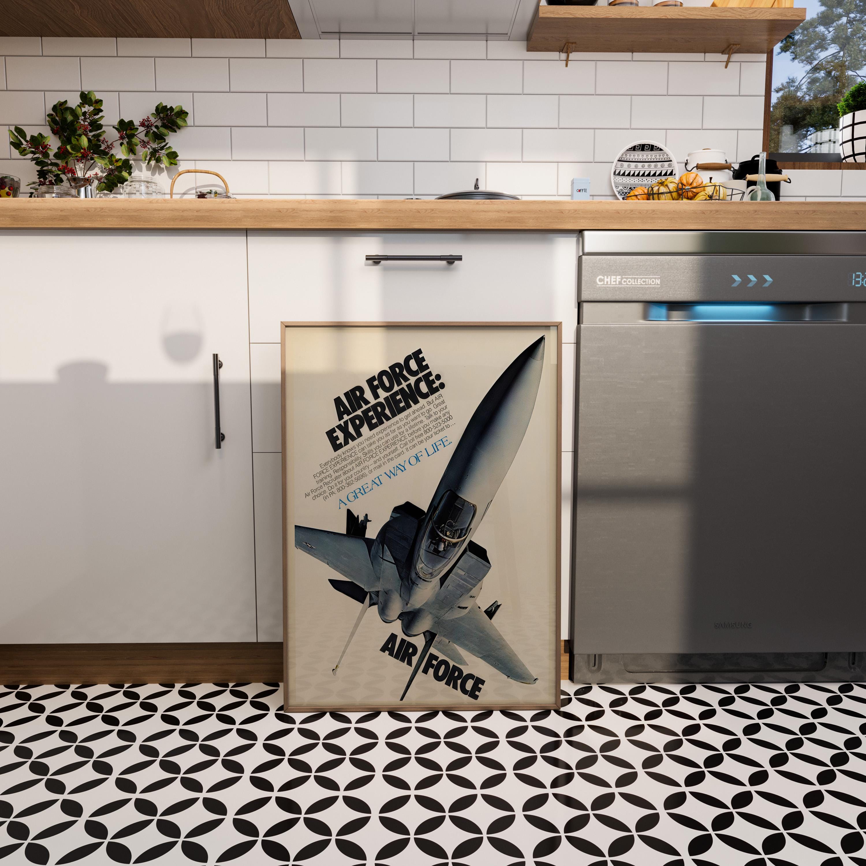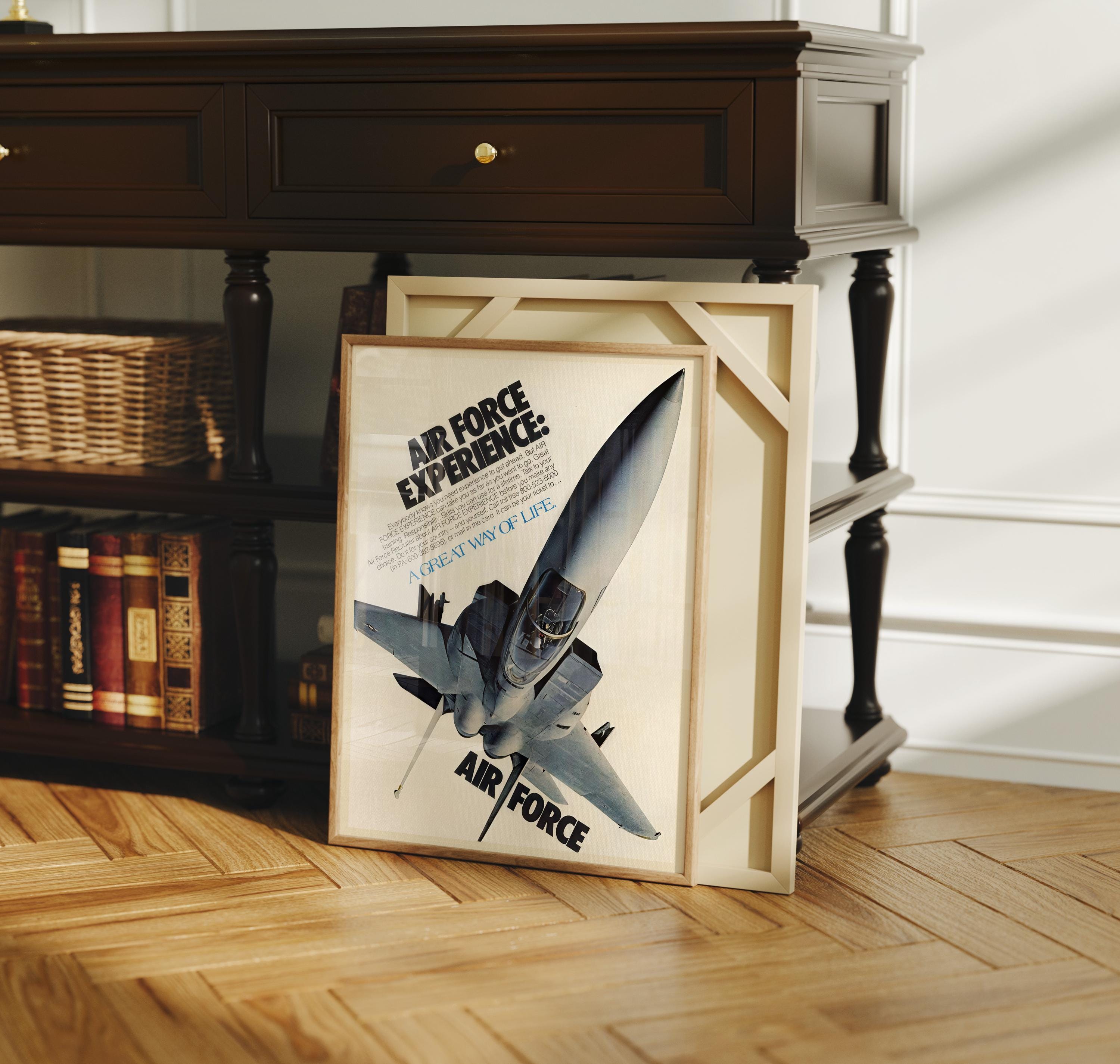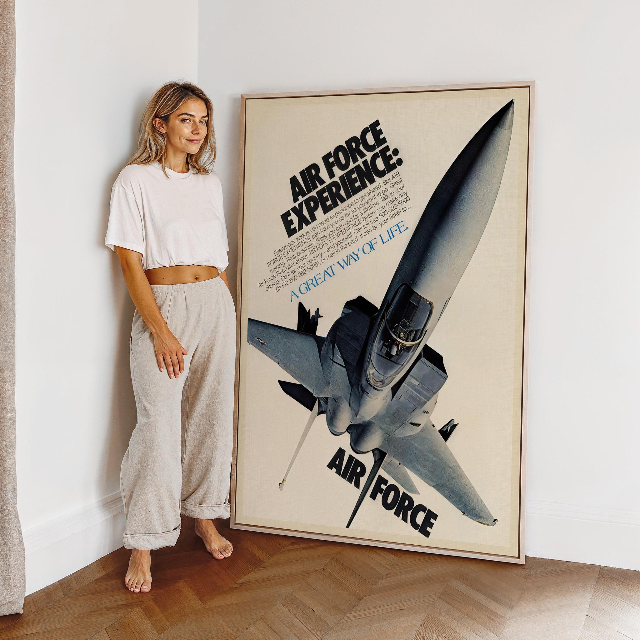 There’s a certain energy in this image the sharp nose of an F-15 Eagle slicing through white airspace, the words “Air Force Experience” standing bold beside it. This poster captures not just a machine, but an era when flight was a statement of ambition and confidence.