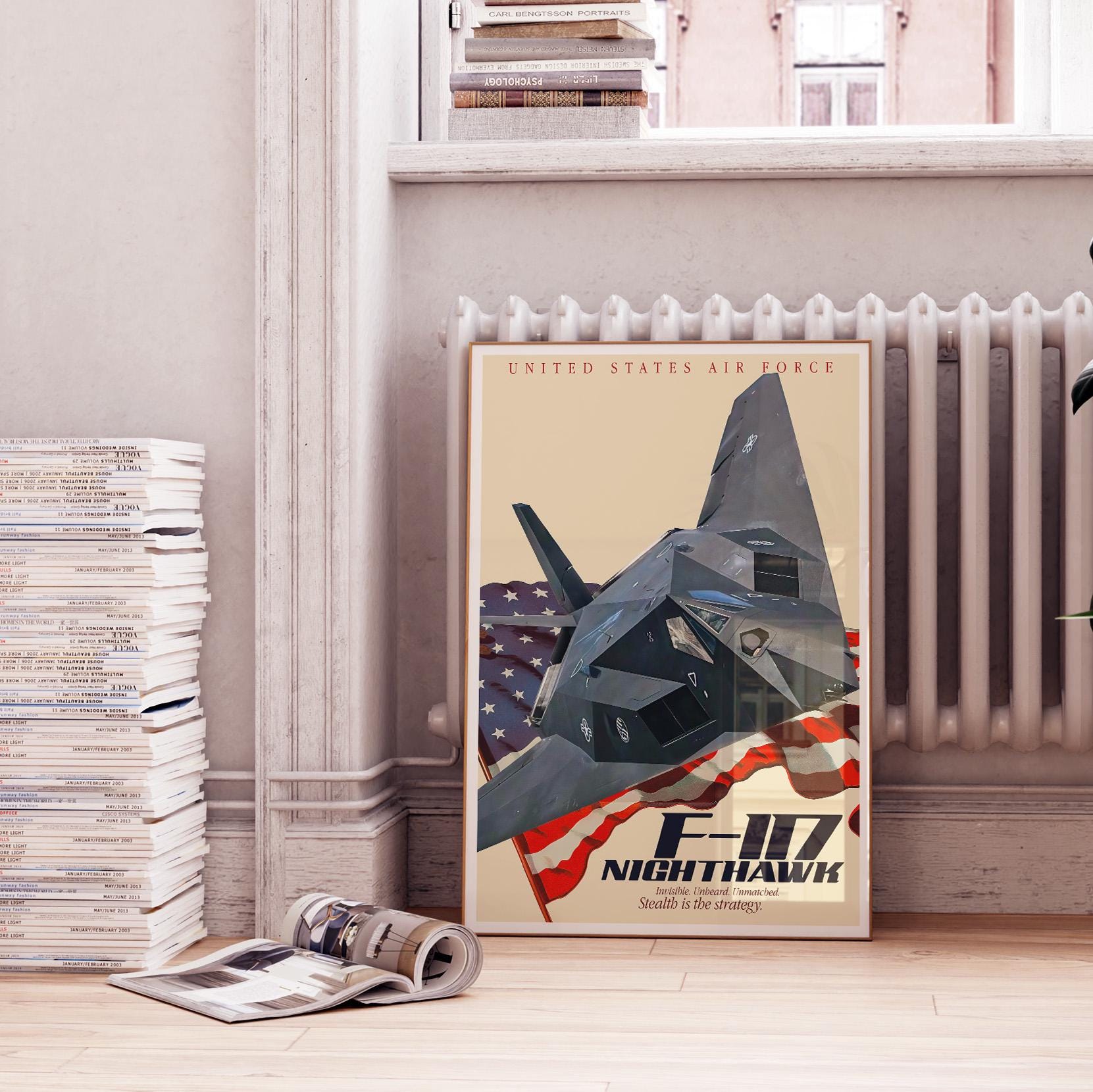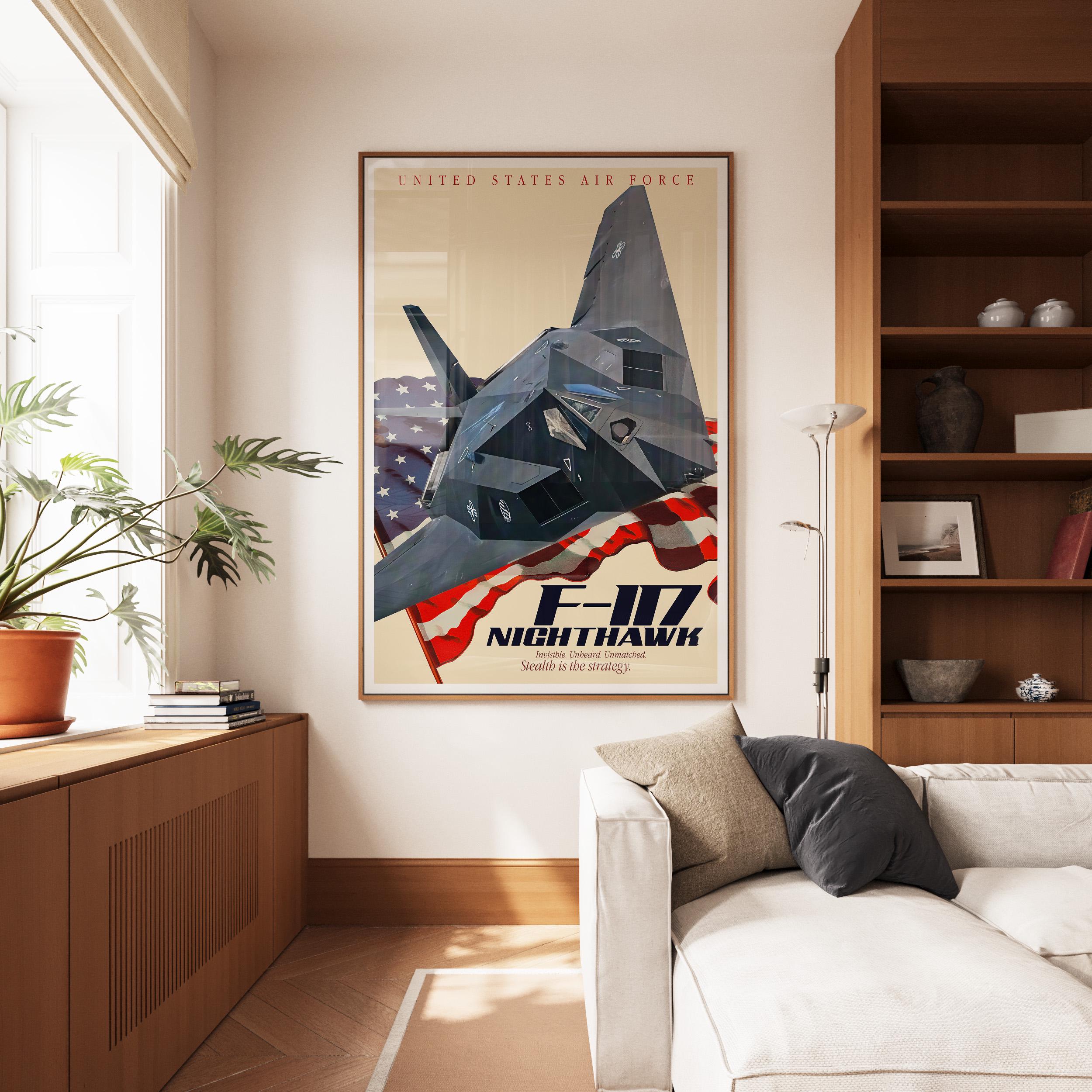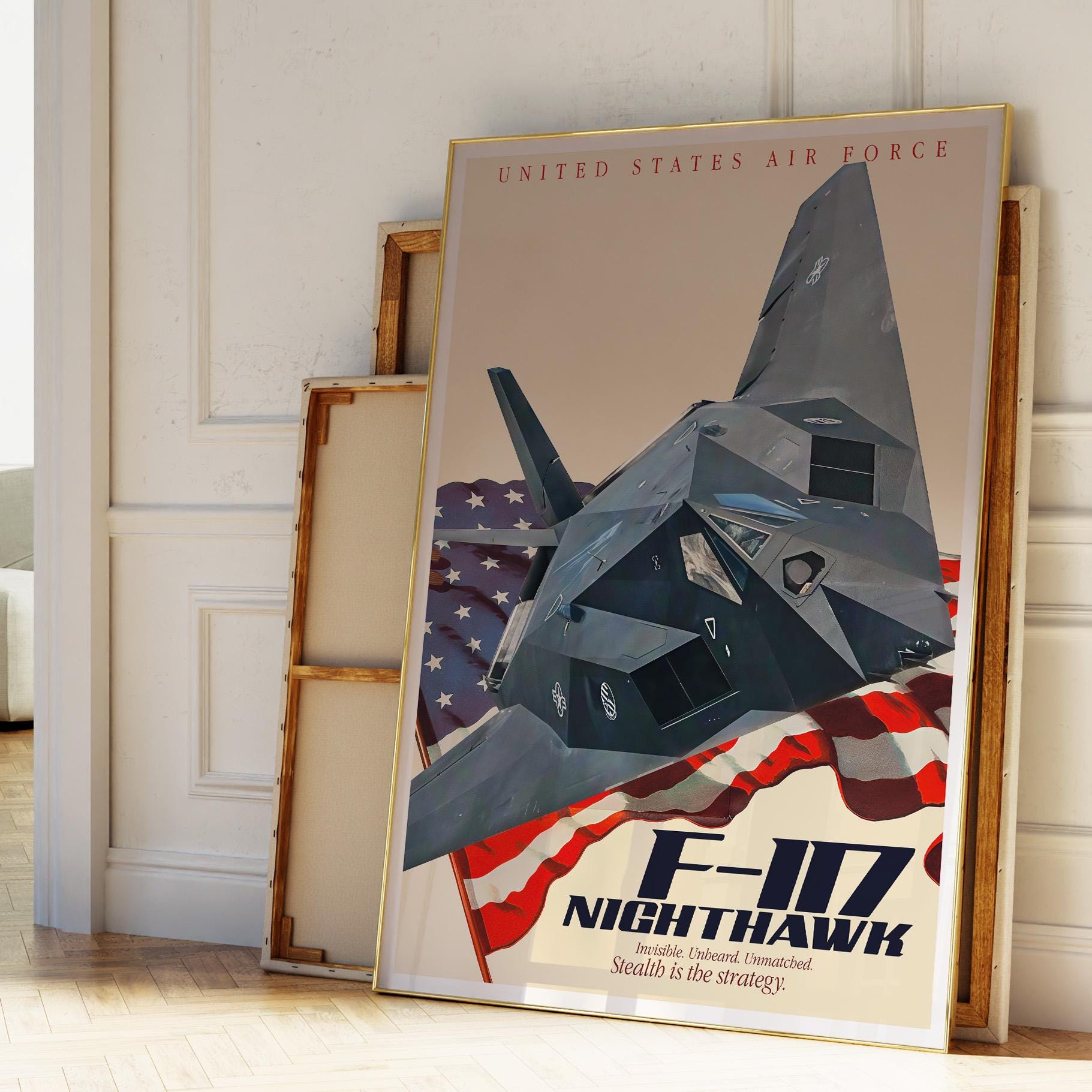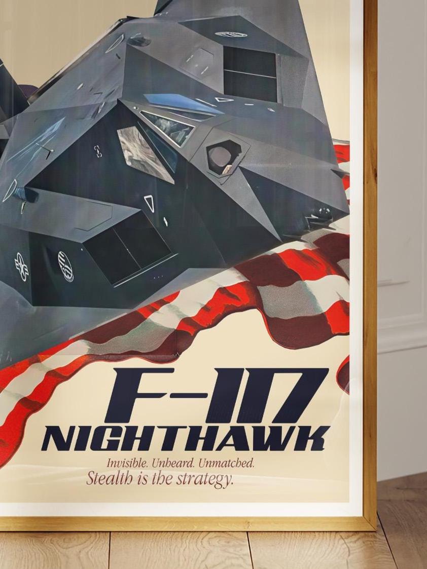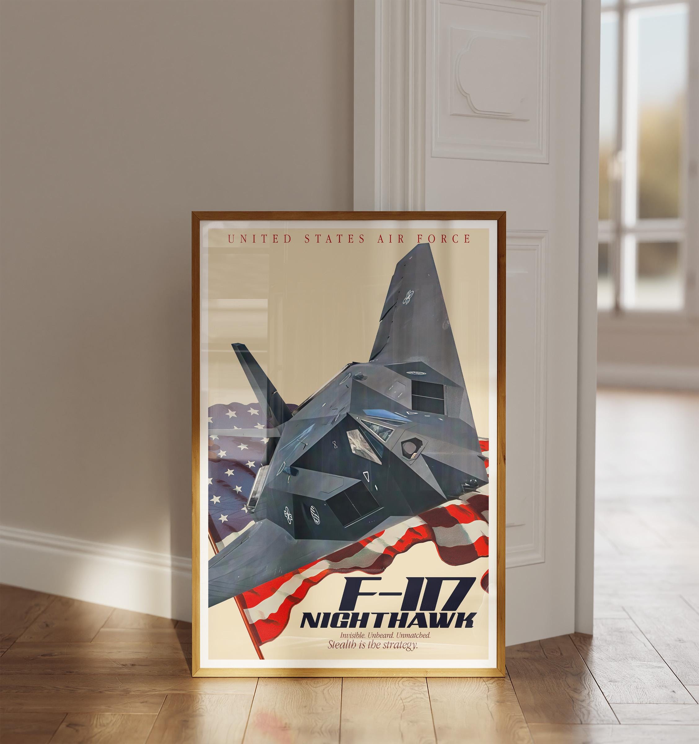 F-117 Nighthawk poster, stealth aircraft wall art, USAF jet print, aviation decor, modern military art, stealth fighter gift, American Air Force poster, jet wall art, vintage airplane artwork, jet lover gift, aviation history print, pilot room decor, black jet poster, stealth technology art, radar evasion aircraft, modern warplane poster, US Air Force gift, fighter jet illustration, aviation photography poster, aircraft collector art, air dominance design, stealth bomber print