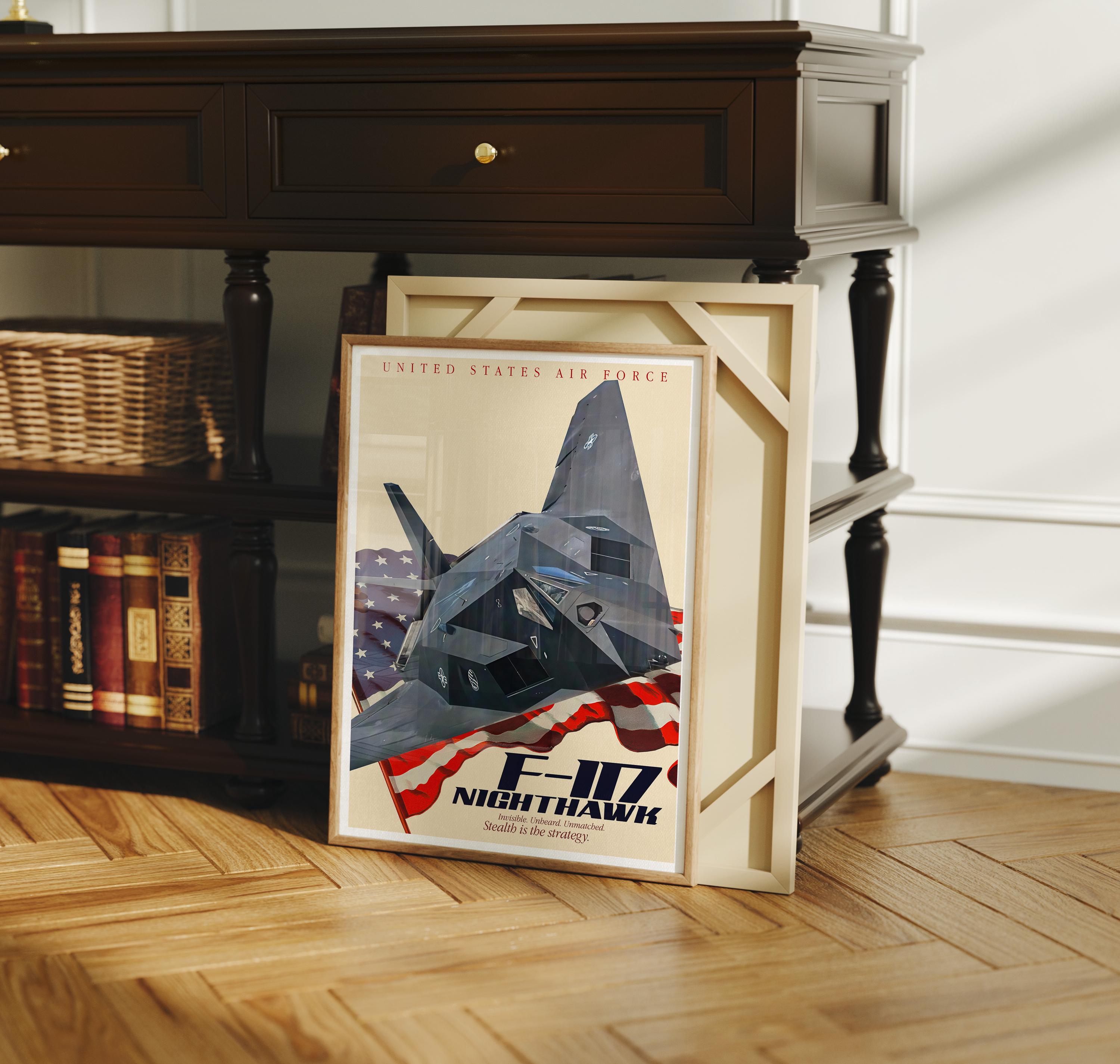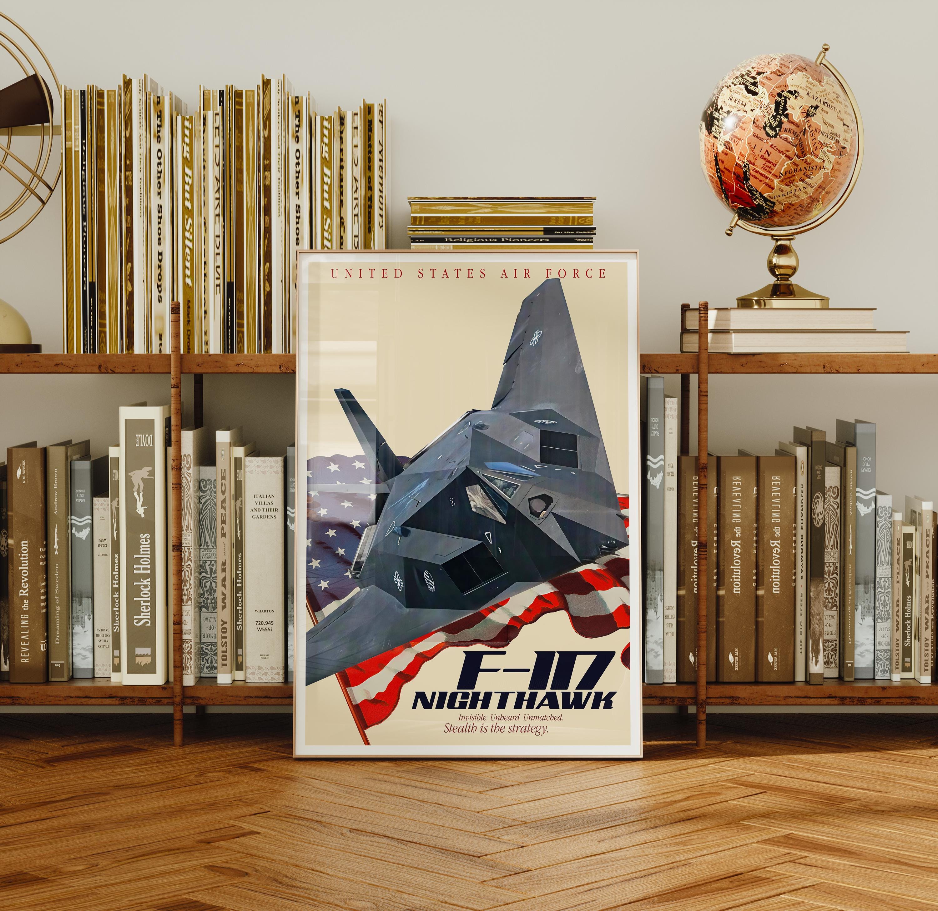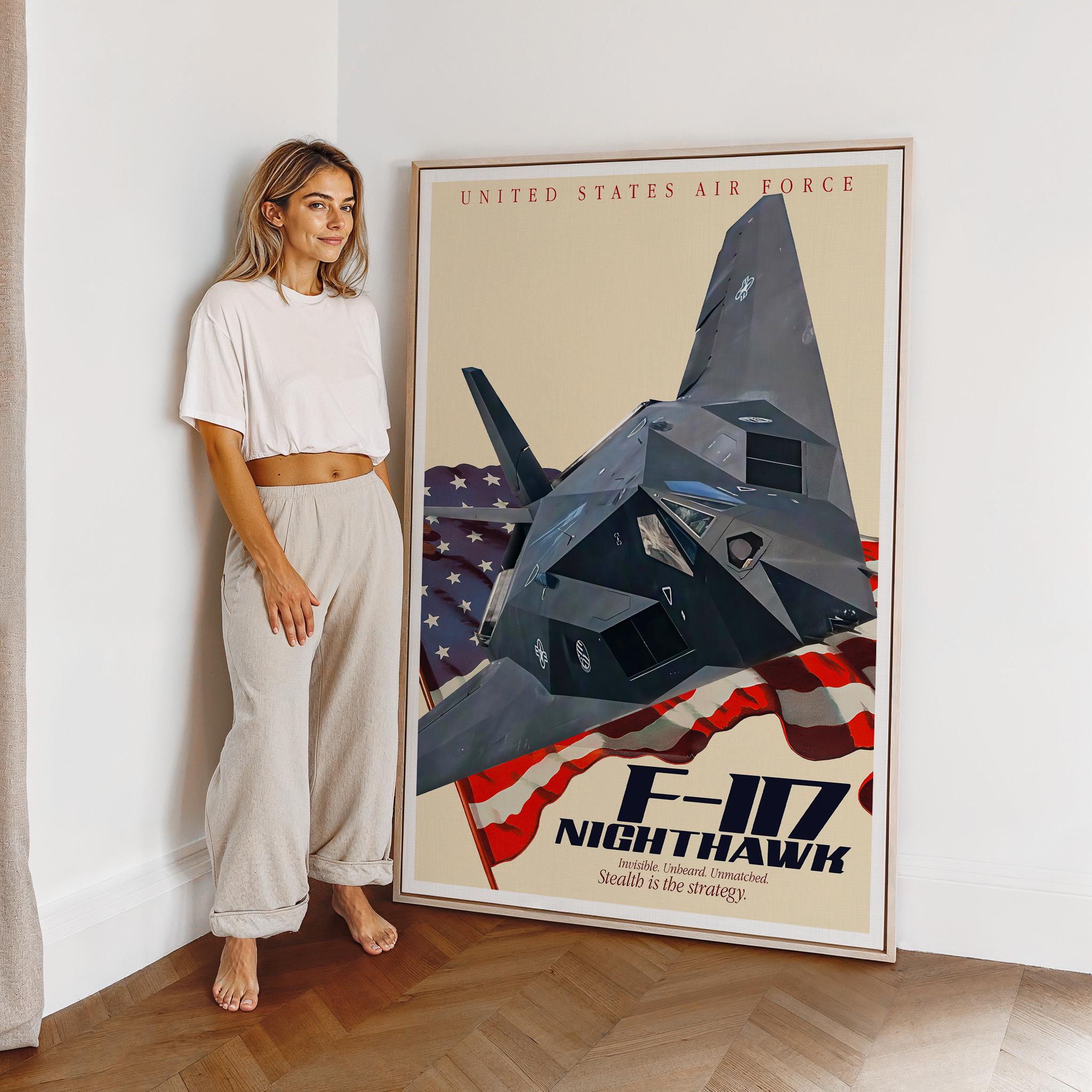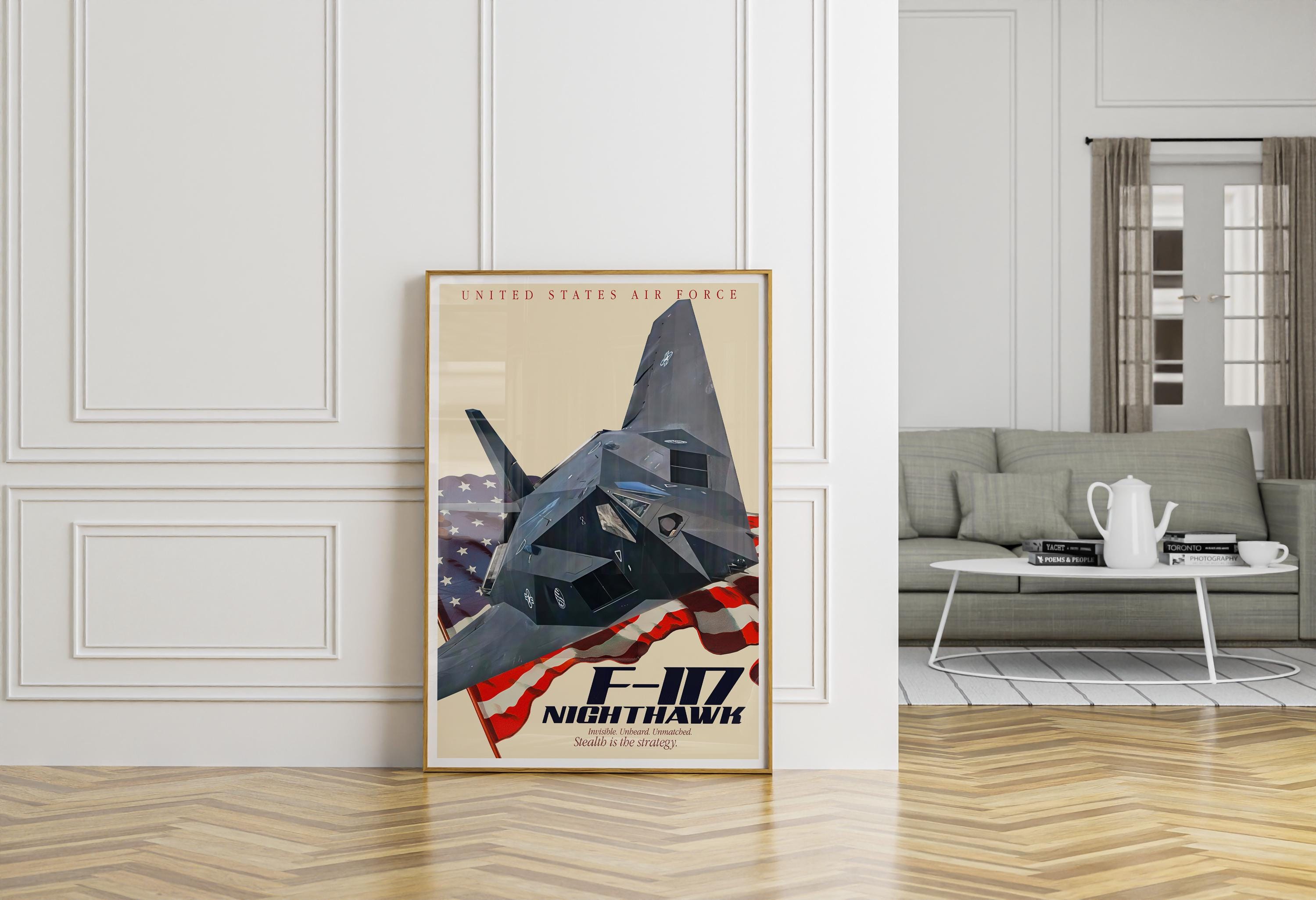 F-117 Nighthawk poster, stealth aircraft wall art, USAF jet print, aviation decor, modern military art, stealth fighter gift, American Air Force poster, jet wall art, vintage airplane artwork, jet lover gift, aviation history print, pilot room decor, black jet poster, stealth technology art, radar evasion aircraft, modern warplane poster, US Air Force gift, fighter jet illustration, aviation photography poster, aircraft collector art, air dominance design, stealth bomber print