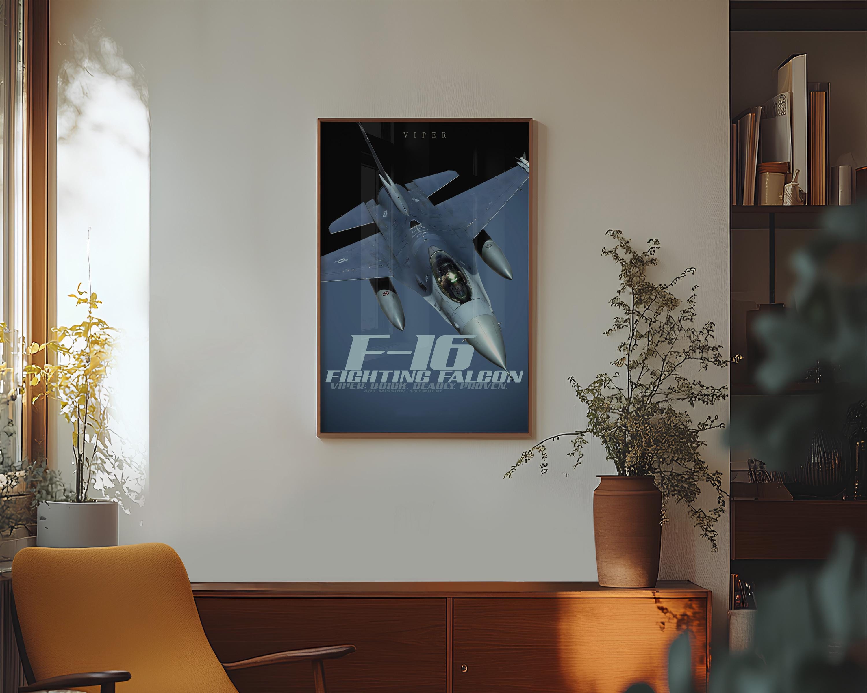 Experience the speed, power, and precision of the legendary F-16 Fighting Falcon with this striking aviation poster. Known to pilots as the “Viper,” this aircraft has become a global icon of air superiority, blending agility, reliability, and lethal design into one sleek silhouette.