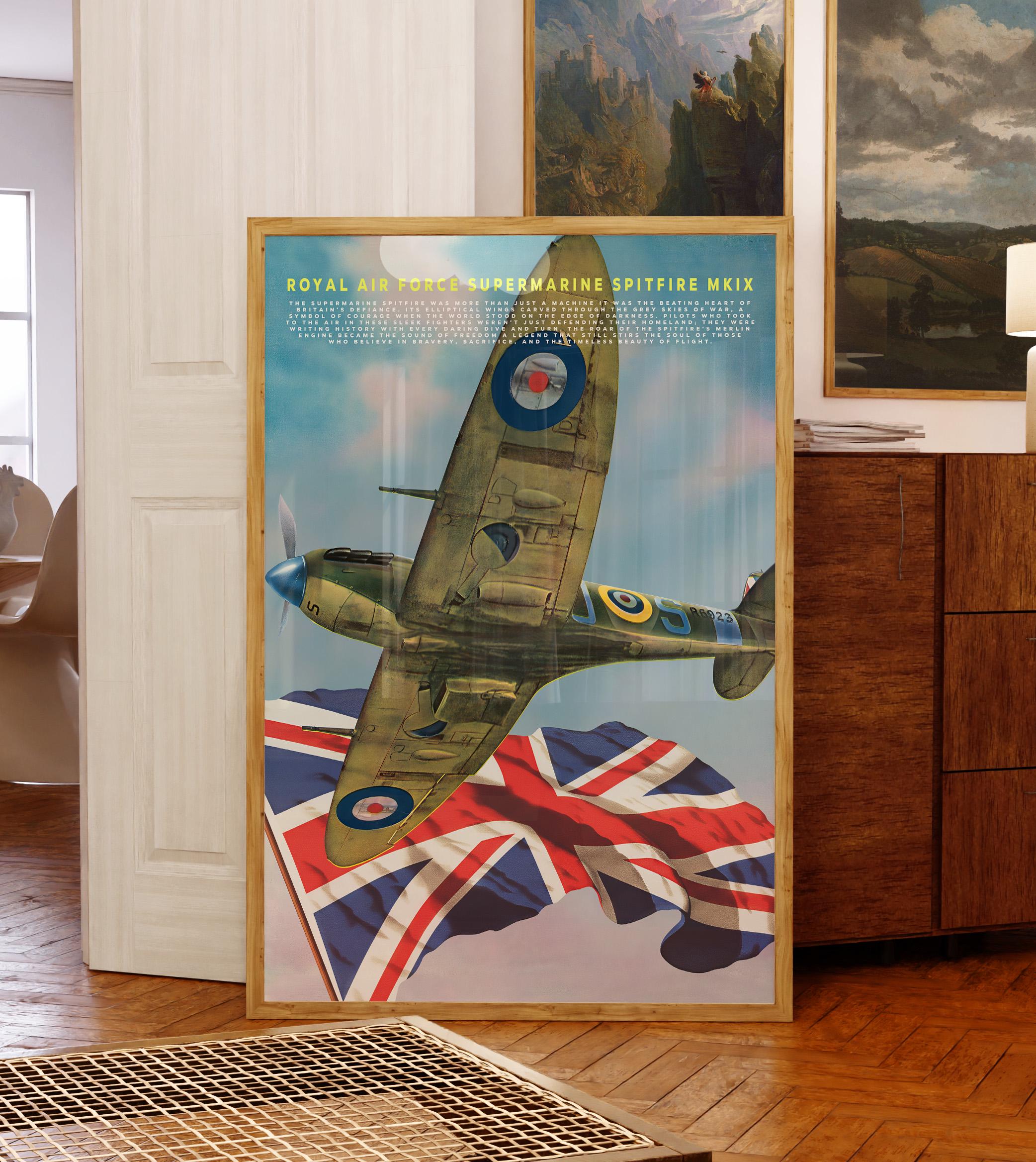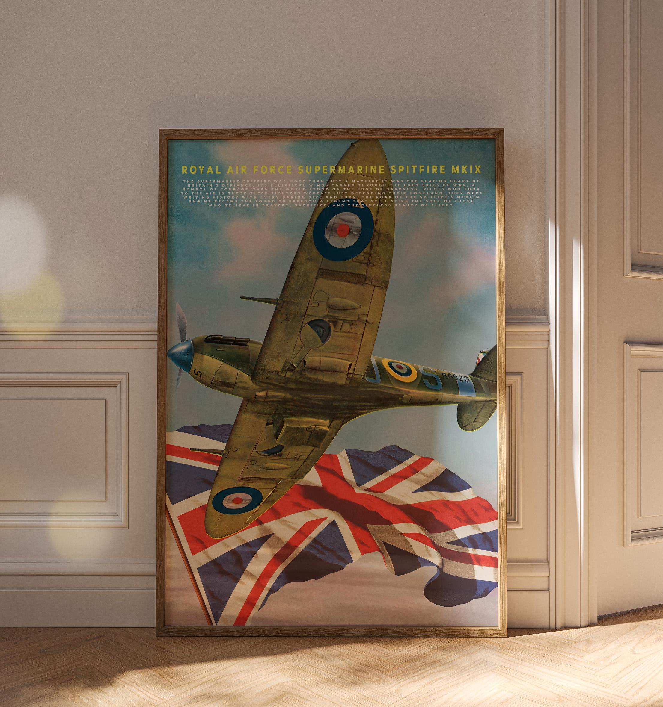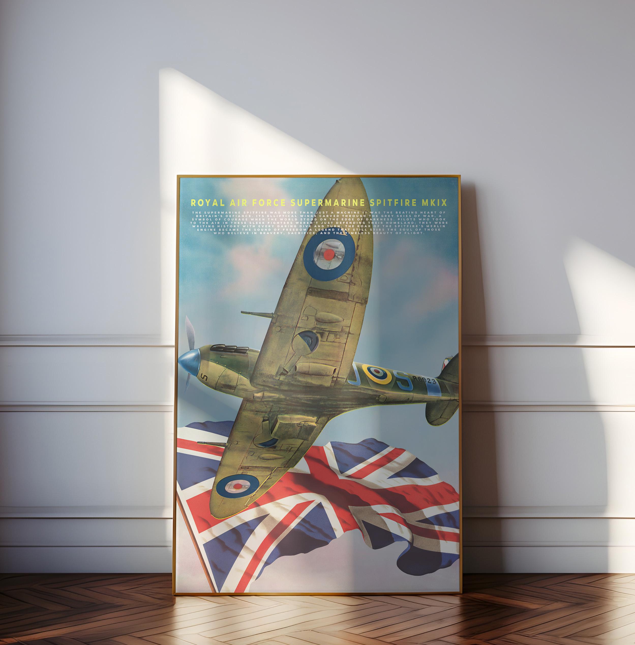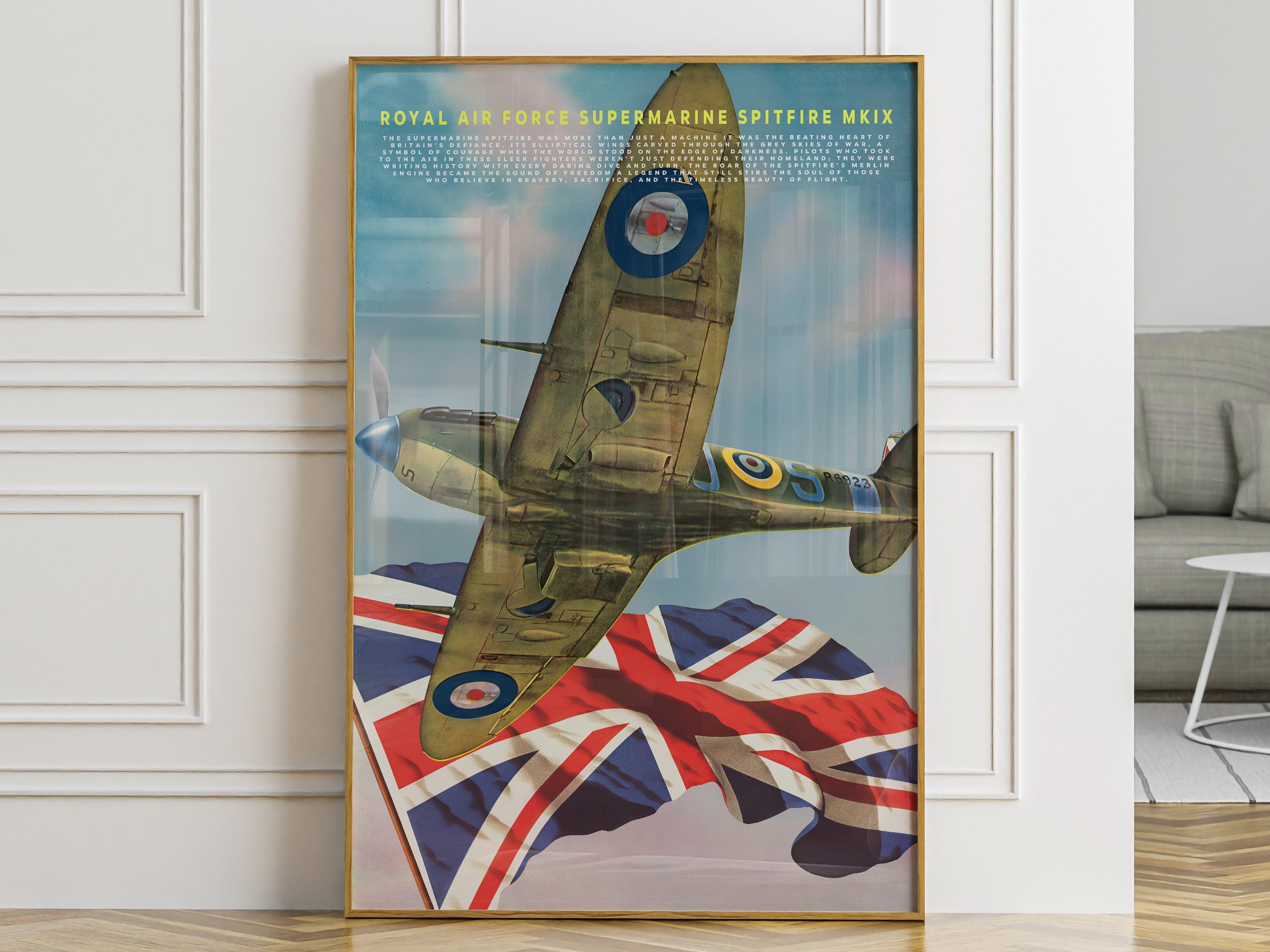 Celebrate the legendary spirit of the Royal Air Force with this striking poster featuring the Supermarine Spitfire MK IX one of the most iconic aircraft ever built. Its graceful elliptical wings and roaring Merlin engine once carried Britain’s hopes through the stormy skies of World War II, standing as a defiant symbol of courage and freedom.