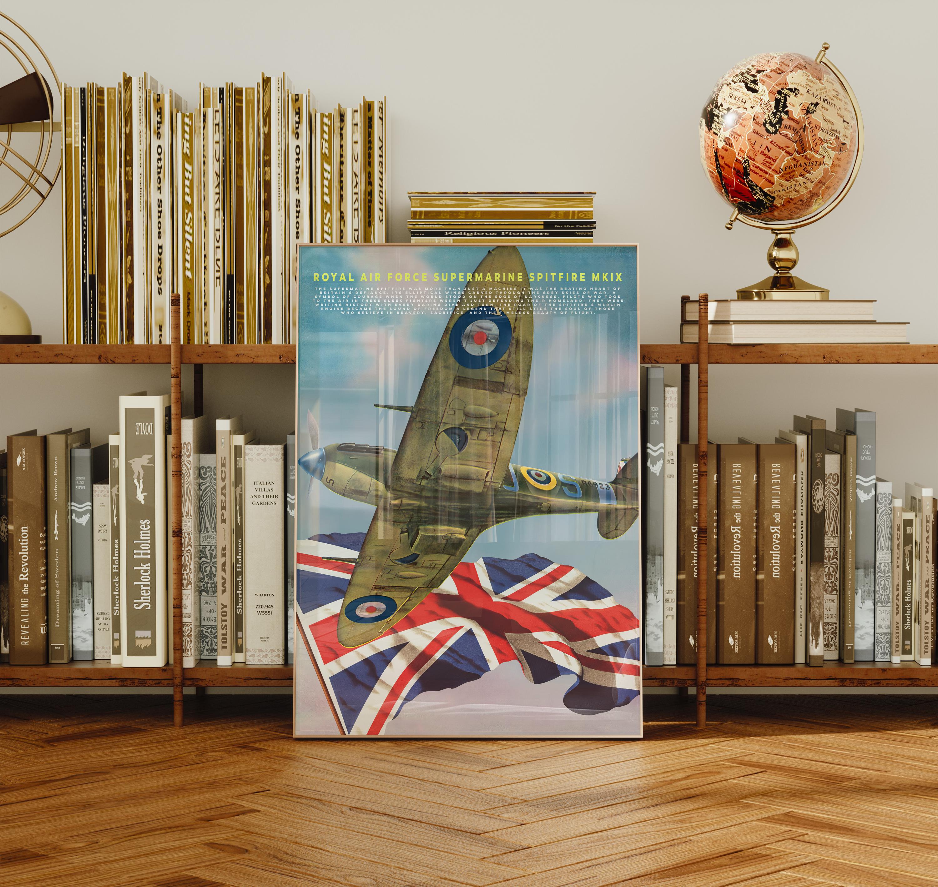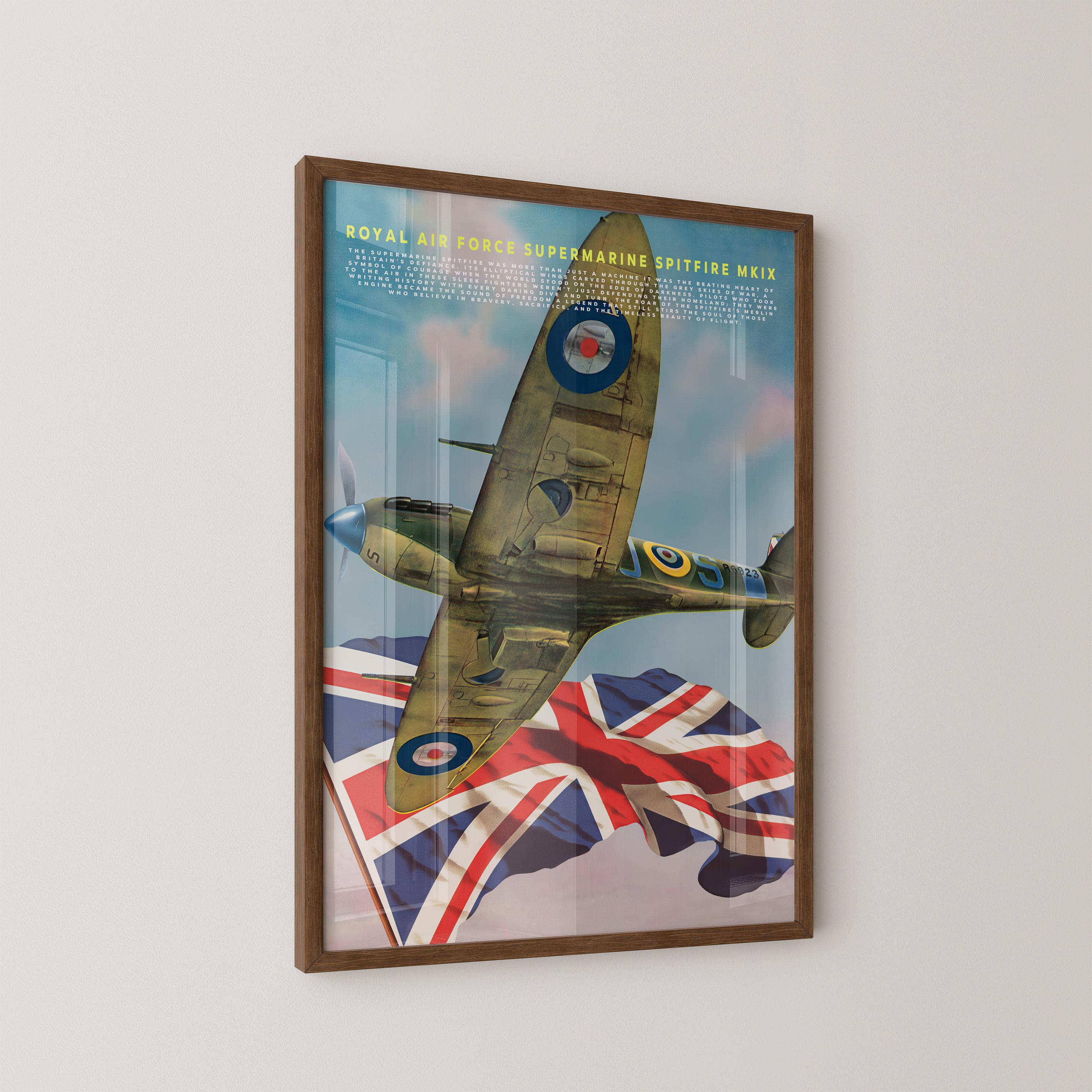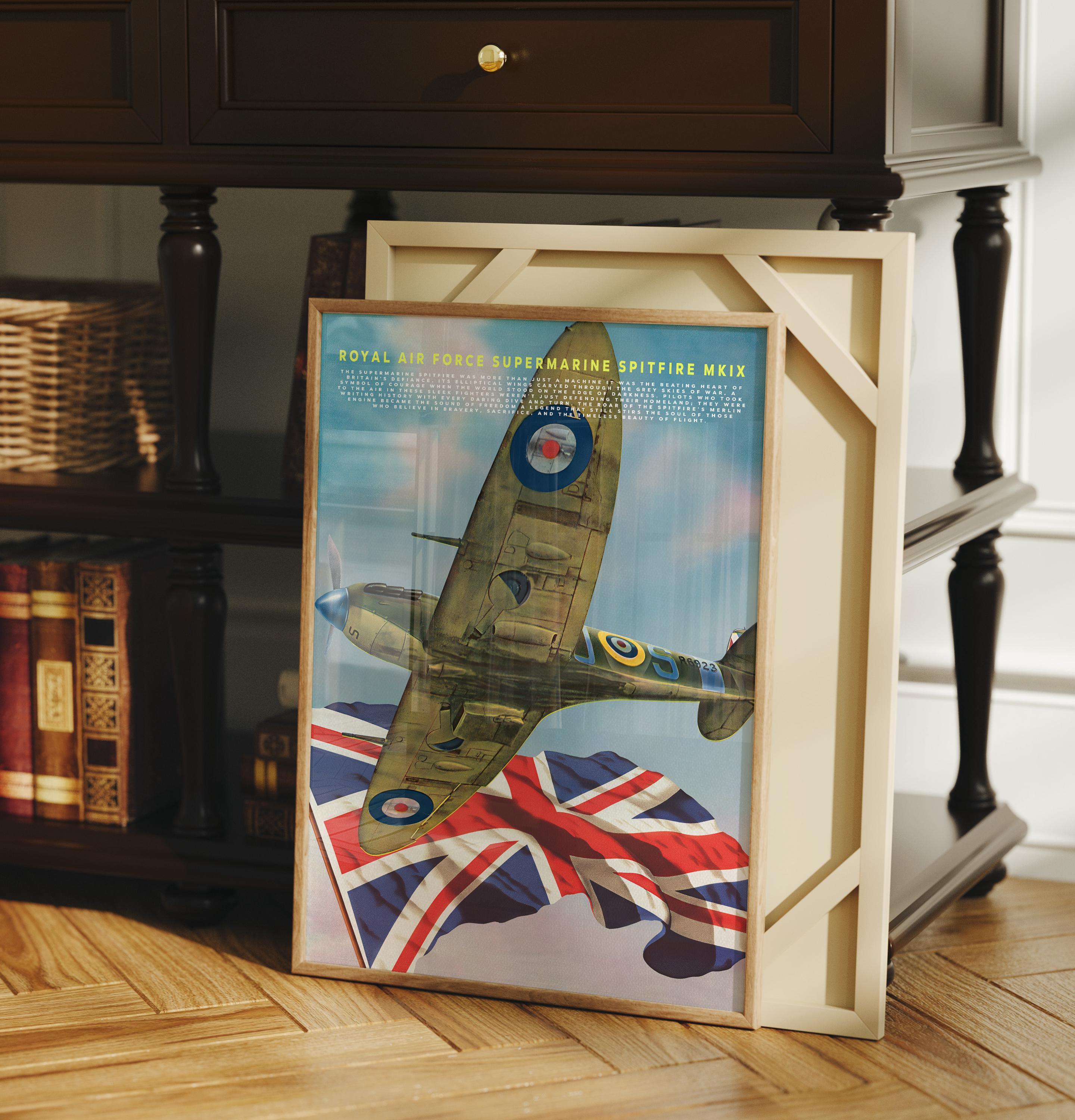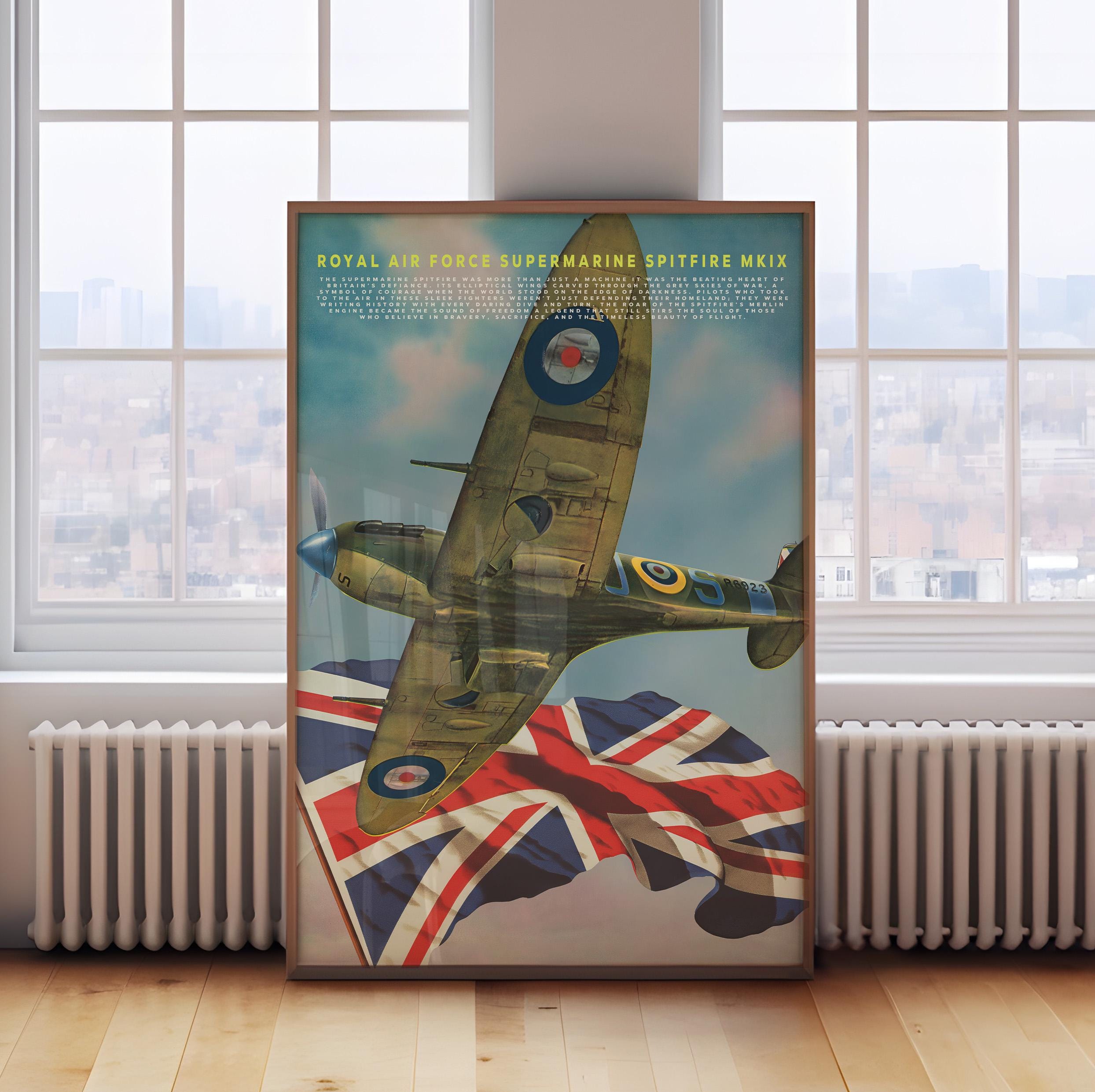 Celebrate the legendary spirit of the Royal Air Force with this striking poster featuring the Supermarine Spitfire MK IX one of the most iconic aircraft ever built. Its graceful elliptical wings and roaring Merlin engine once carried Britain’s hopes through the stormy skies of World War II, standing as a defiant symbol of courage and freedom.