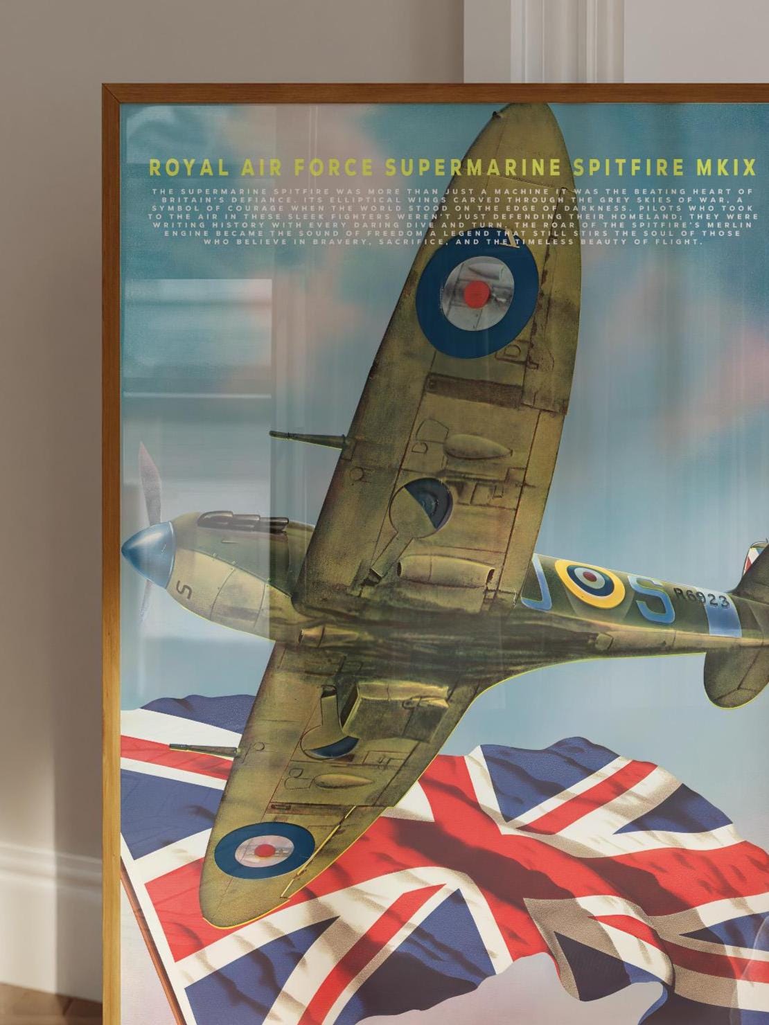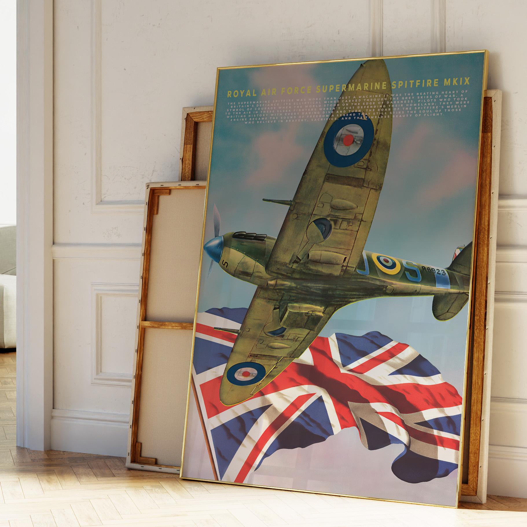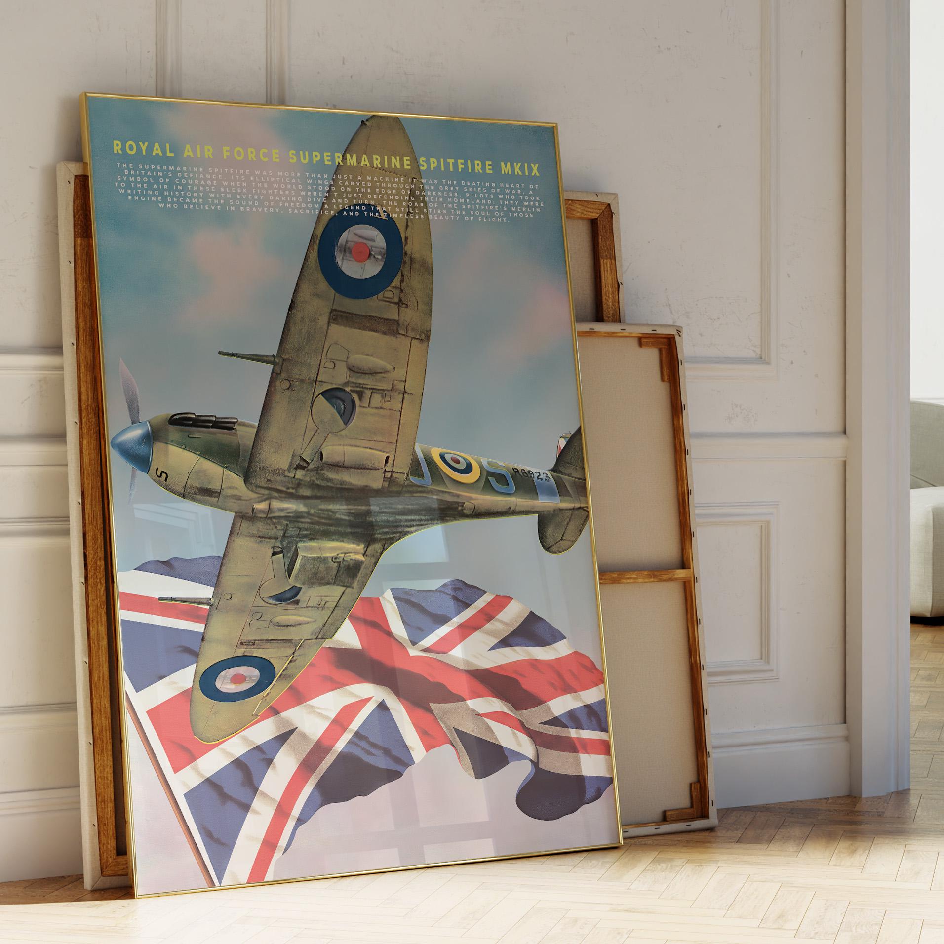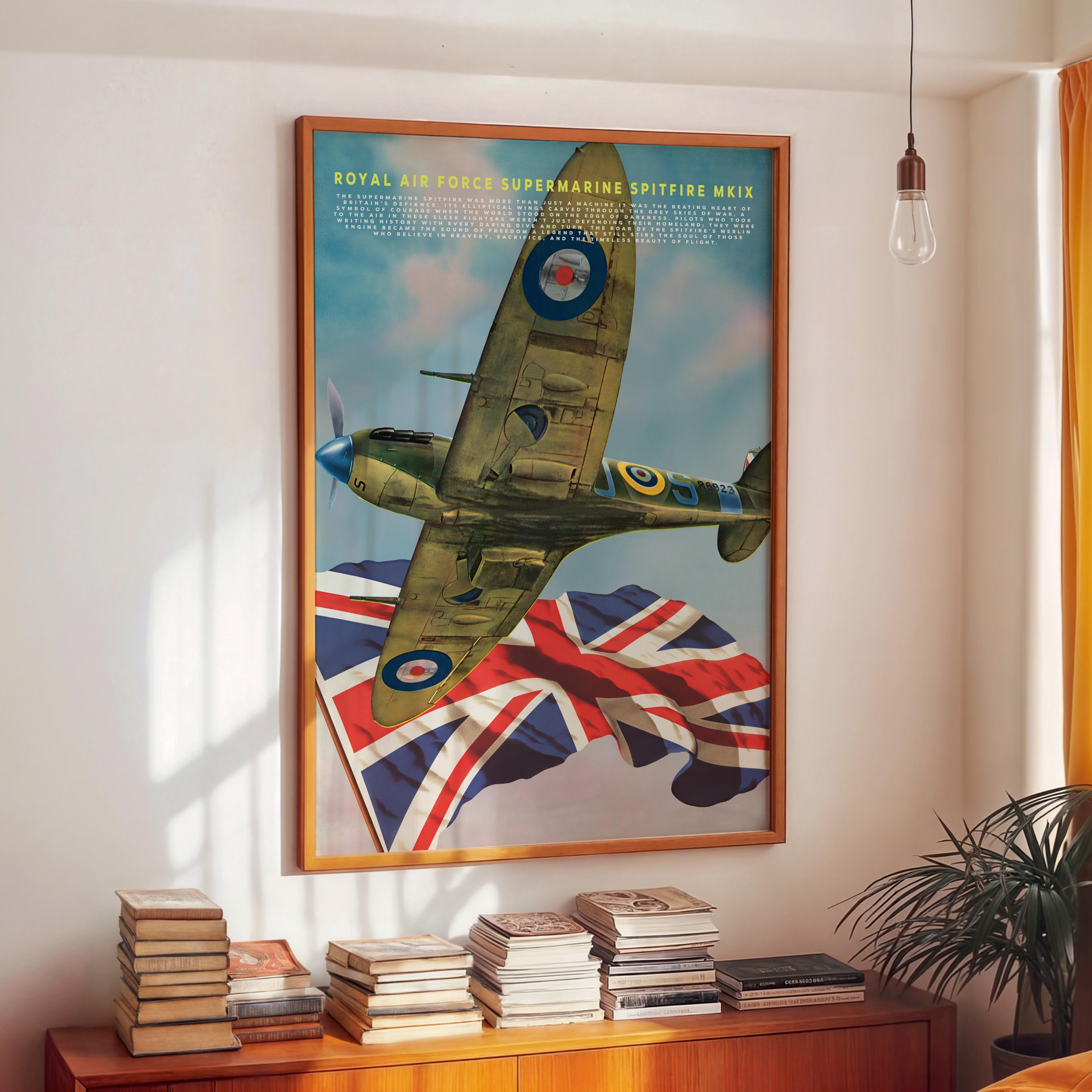 Celebrate the legendary spirit of the Royal Air Force with this striking poster featuring the Supermarine Spitfire MK IX one of the most iconic aircraft ever built. Its graceful elliptical wings and roaring Merlin engine once carried Britain’s hopes through the stormy skies of World War II, standing as a defiant symbol of courage and freedom.