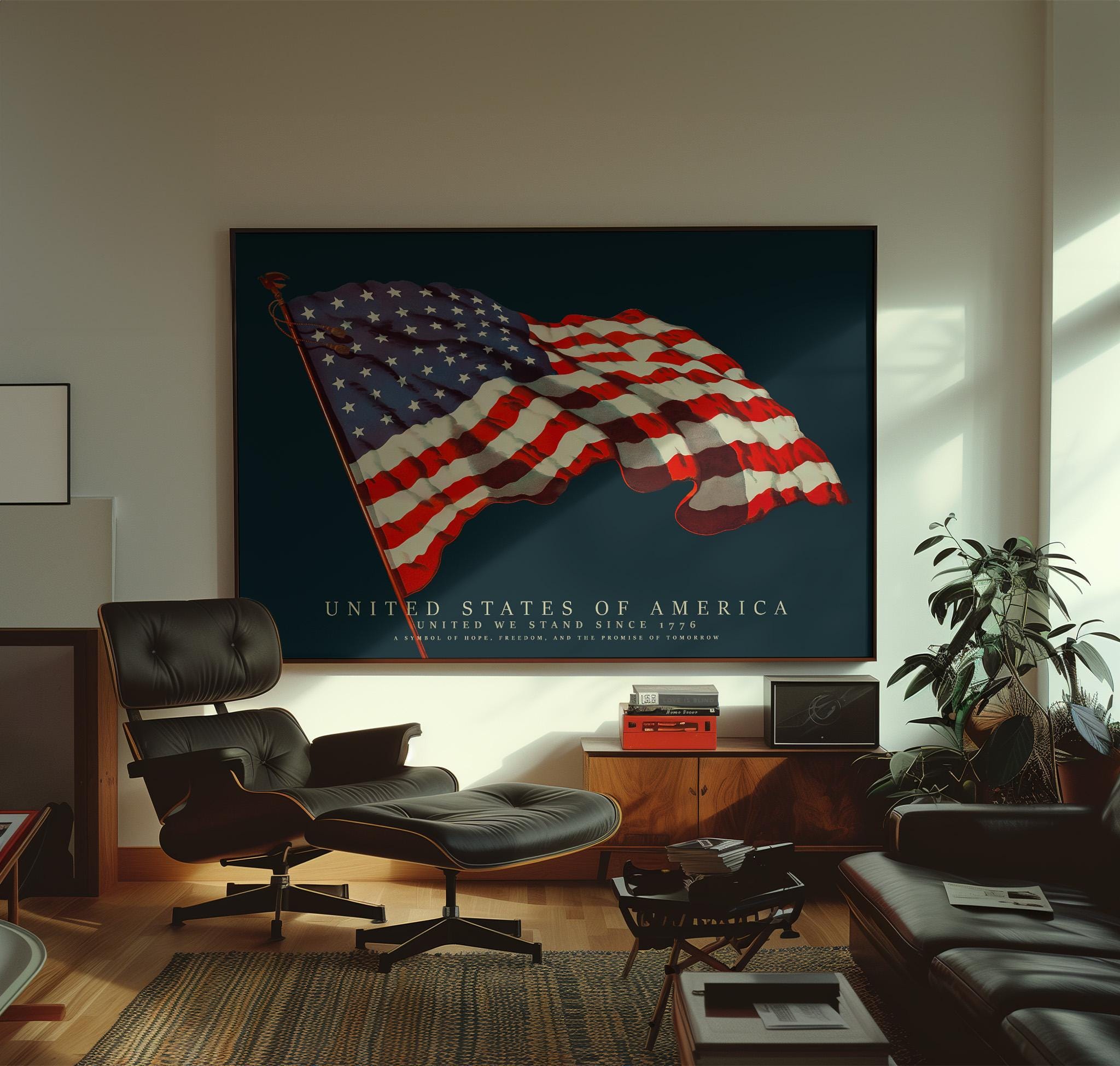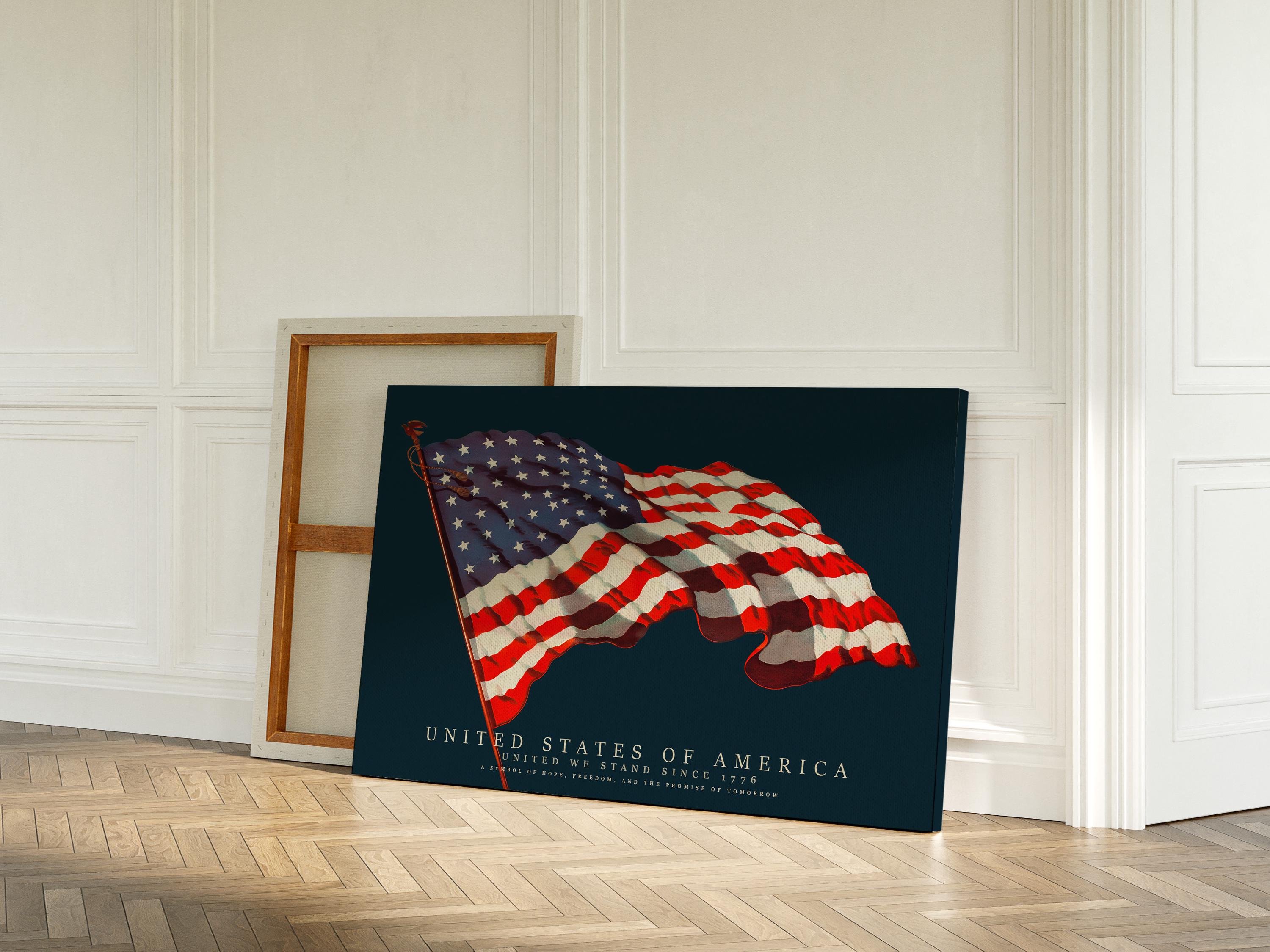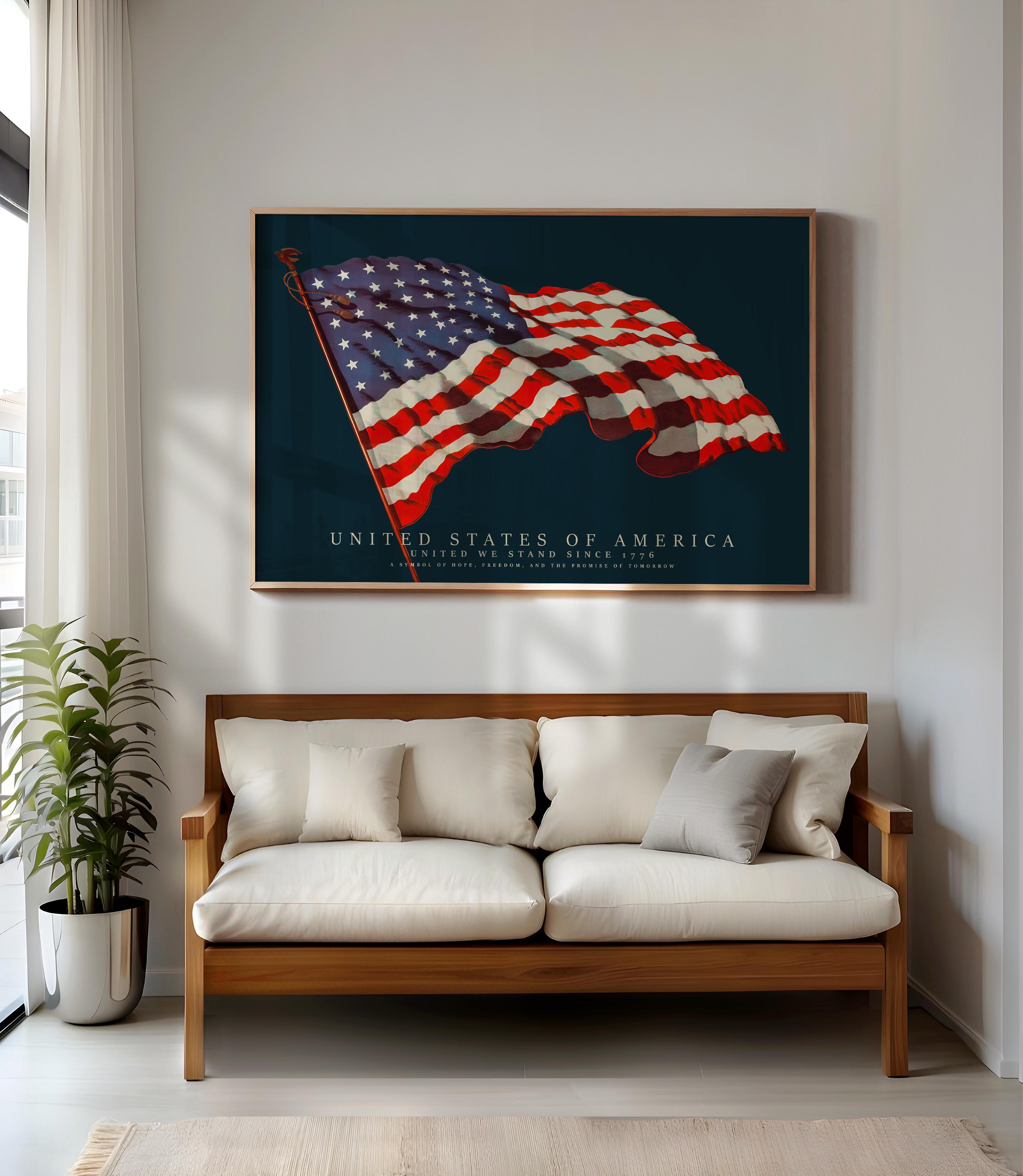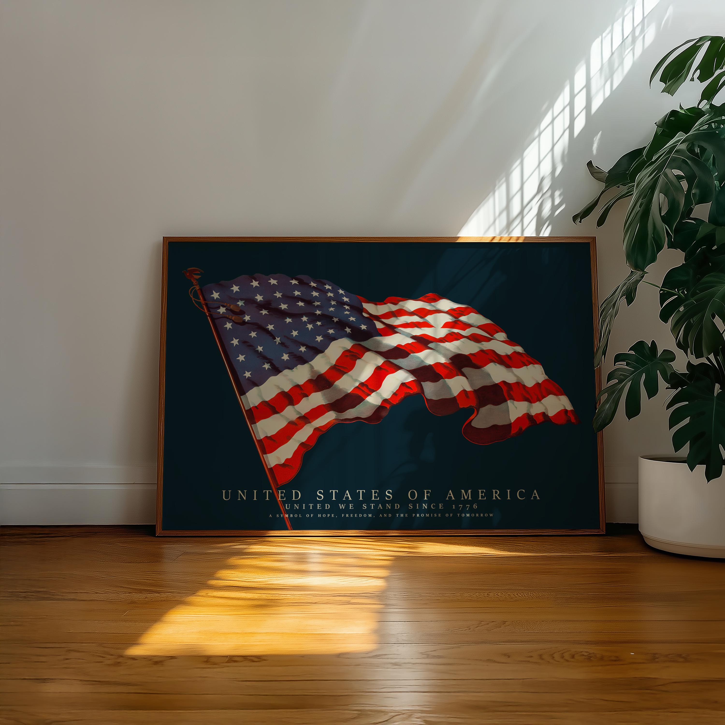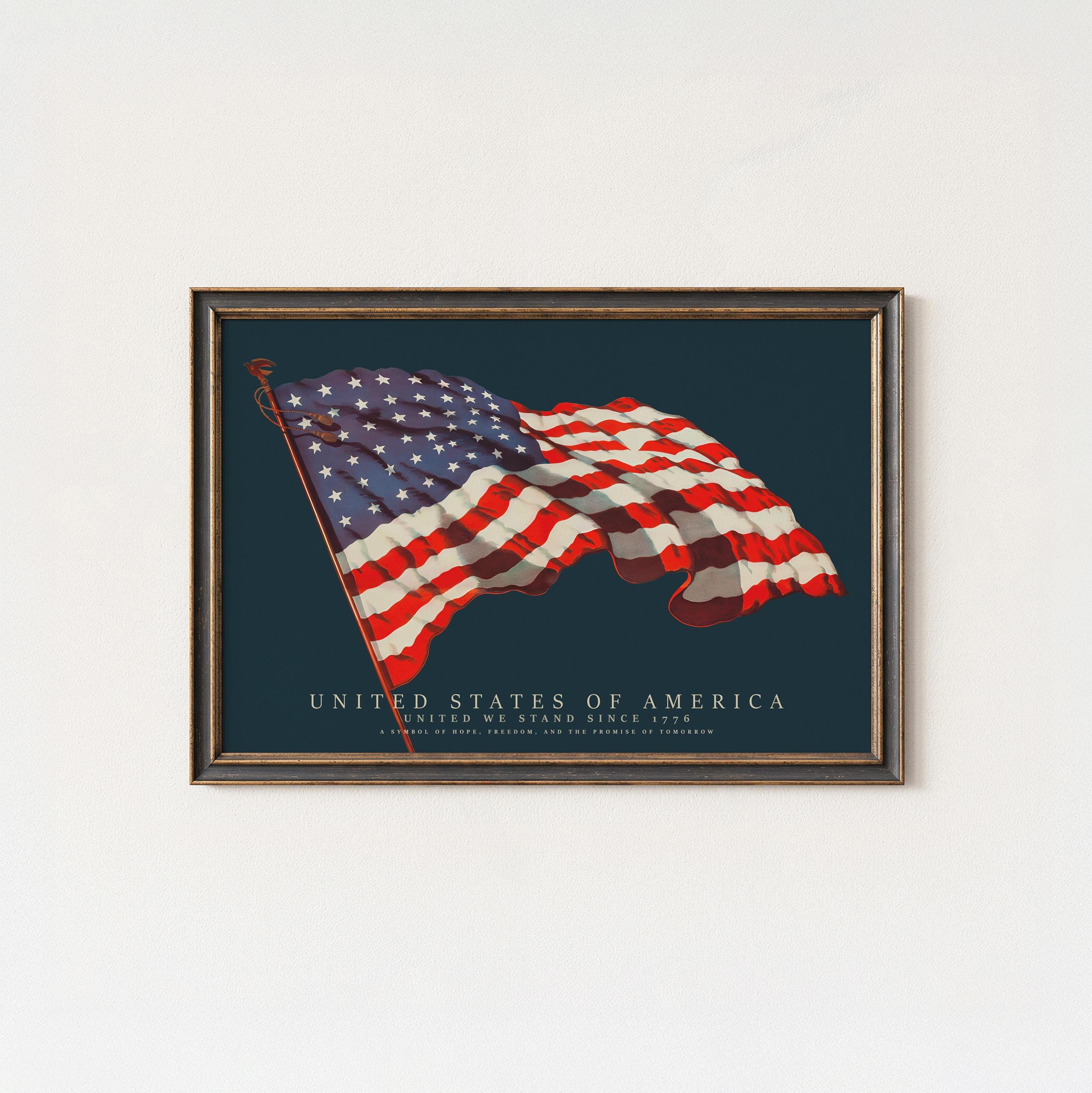 This vintage-style illustration of the United States flag beautifully captures the spirit of unity, freedom, and heritage. Restored in high resolution, it brings classic Americana charm and bold color to any space perfect for homes, offices, libraries, and patriotic interiors.